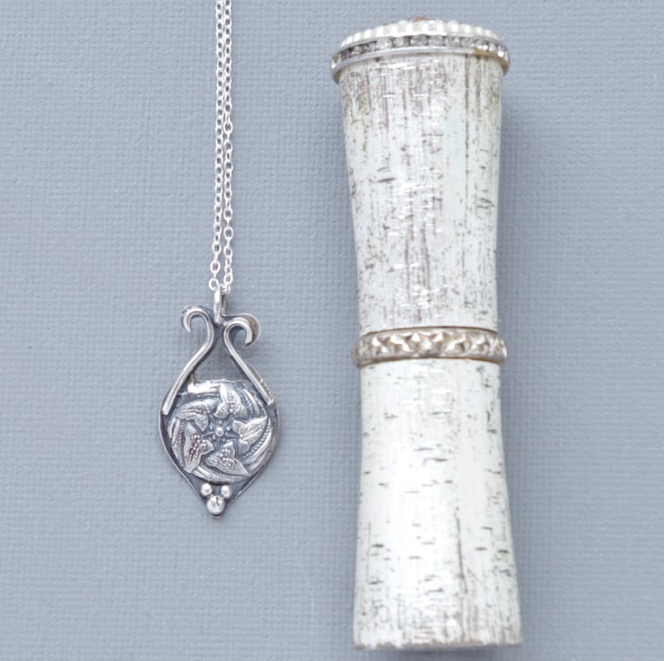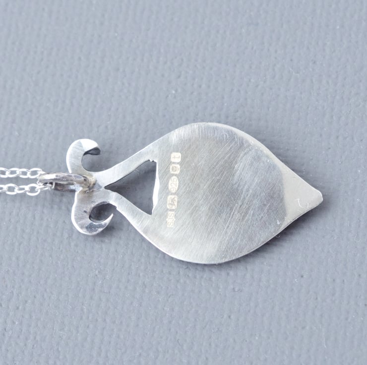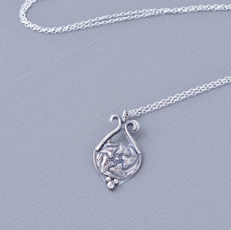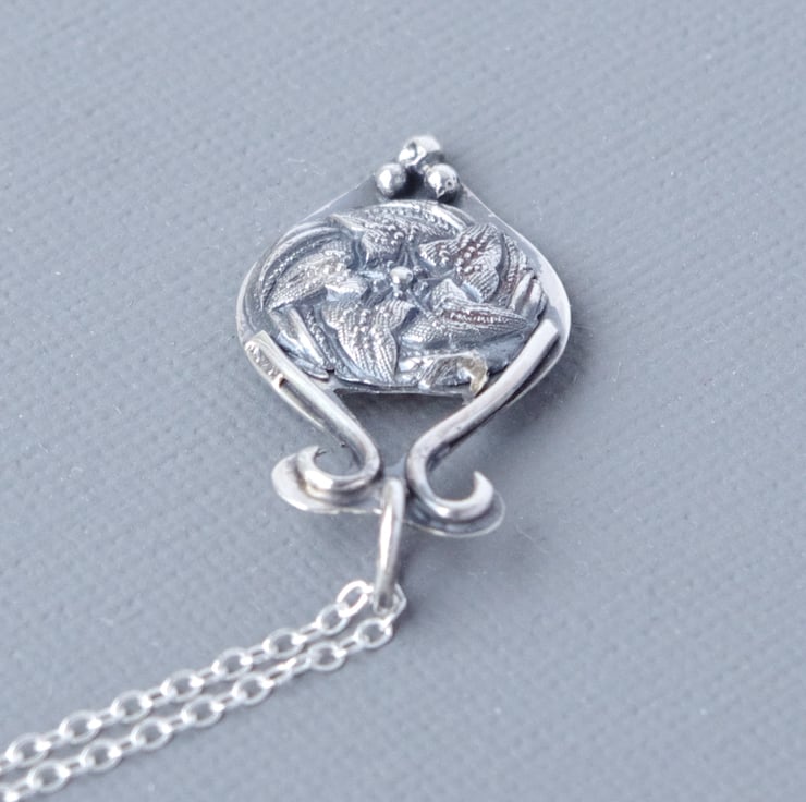 This pendant is one of a series I have cast in recycled fine silver from my own collection of antique glass buttons from the Victorian and Art Nouveau periods. I use fine silver clay for these projects, which enables me to cast at very low temperatures and produces fewer CO2 emissions. The button I have used is a particular favourite of mine as it features a swirling pattern of Ivy leaves, symbolic of everlasting devotion, all highlighted with fine texture and detail which makes the pendant glitter and come alive with sparkle. In order to enhance the detail I have antiqued the pendant. This would make a lovely gift for anyone who loves wildflowers, plants and gardening. I have created an asymmetrical teardrop shaped base in sterling silver sheet, inspired by the patterns within the button, using a piercing saw. Because these designs are drawn freehand onto the sheet, no two are alike. This pendant measures 30 mm 1 1/4" in length, includes a 450 mm fine sterling silver chain and is fully hallmarked by the London Assay Office, including my own maker's mark. The last photograph in the series shows the pendant photographed with a vintage lipstick case measuring 80 mm or 3".