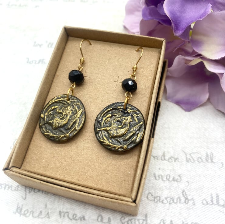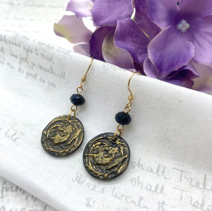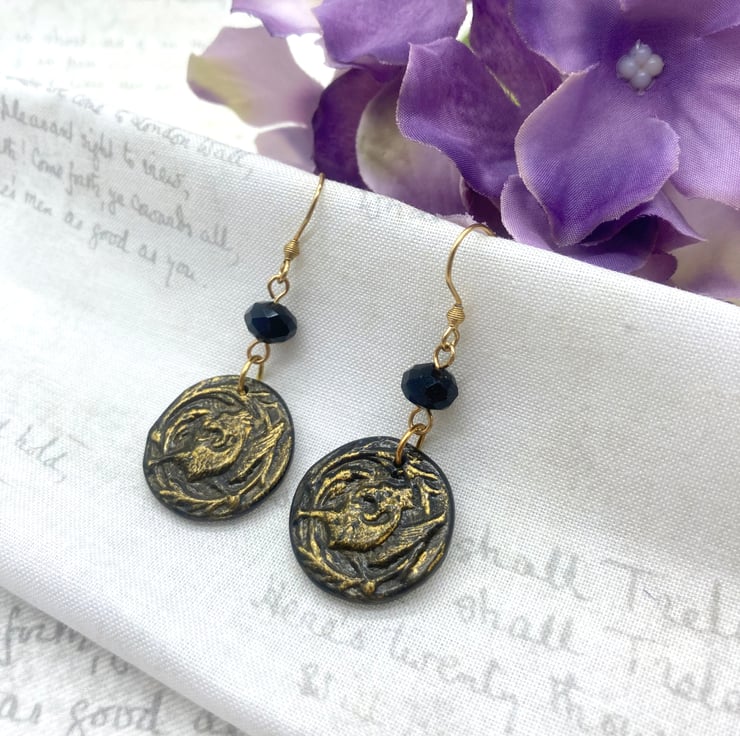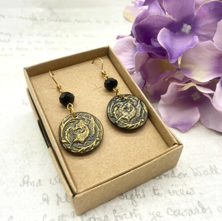 After creating these little medallions, I've brought out the texture of this fabulous Griffin by adding a coat of gold gilding wax over the detail and then a coat of varnish to seal it! I've teamed them up with black faceted Czech glass beads so they sparkle and catch the light when moved or worn.