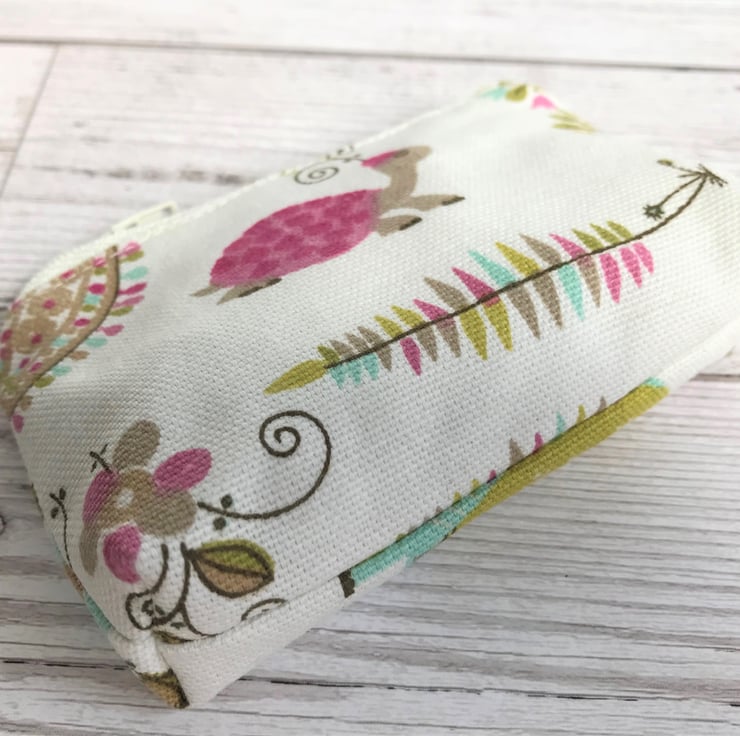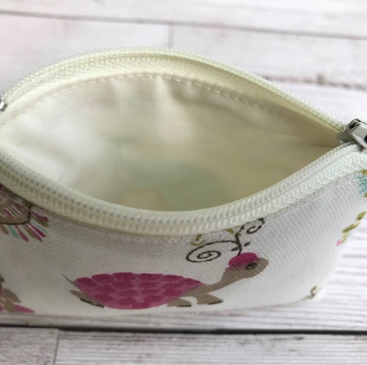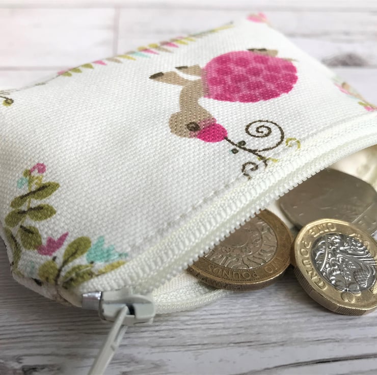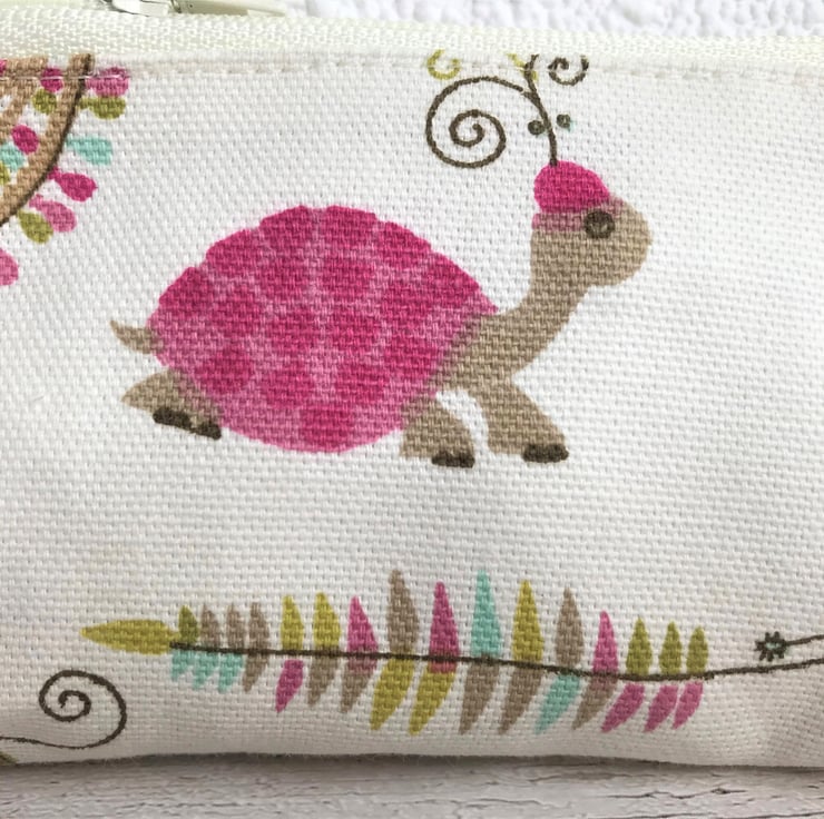 A small coin purse in colourful tropical print fabric. The fabric print features a cute little tortoise with a bright pink shell surrounded by bright, colourful flowers and foliage on a cream background.The coin purse has a cream zip and is lined with cream fabric. The base of the purse is boxed to give more space inside.
