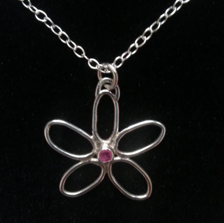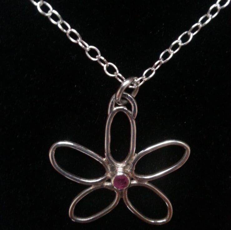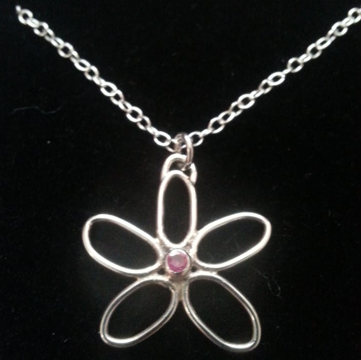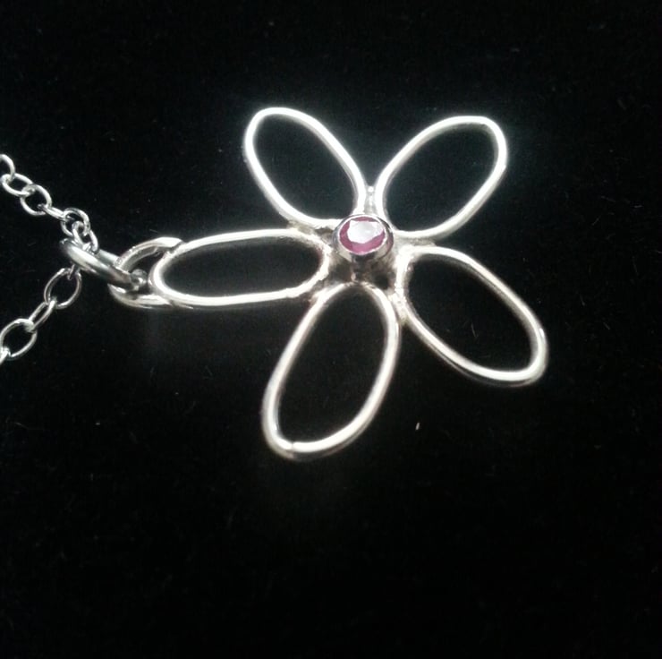 This piece is entirely composed by hand from Sterling silver formed petals with a tiny 2mm ruby is set in the centre.