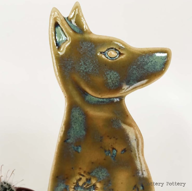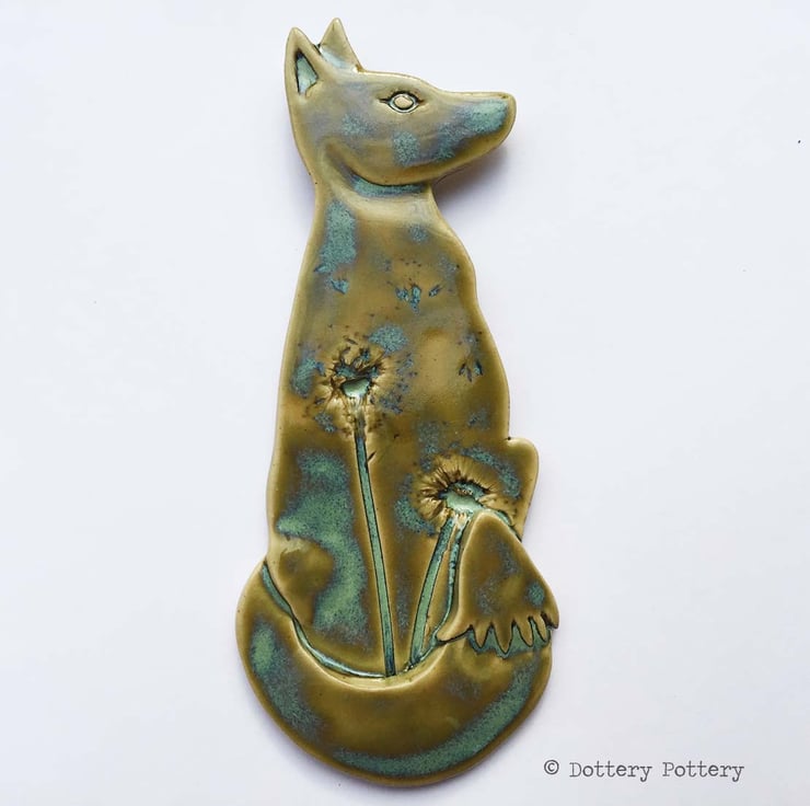This ceramic fox decoration is made from textured stoneware clay with all the individual pieces hand cut and decorated with pattern. It is then fired and decorated with stoneware glazes and re-fired to 1260 degrees making it nice and strong. It has a metal hanging D loop attached to the back so that you can hang it wherever you like. Fox dimensions are 20cm tall x 9cm wide x 1cm deep
