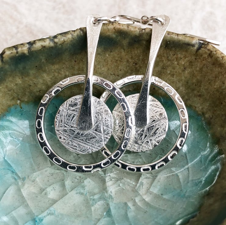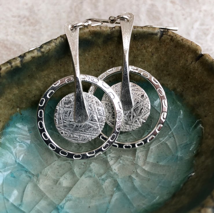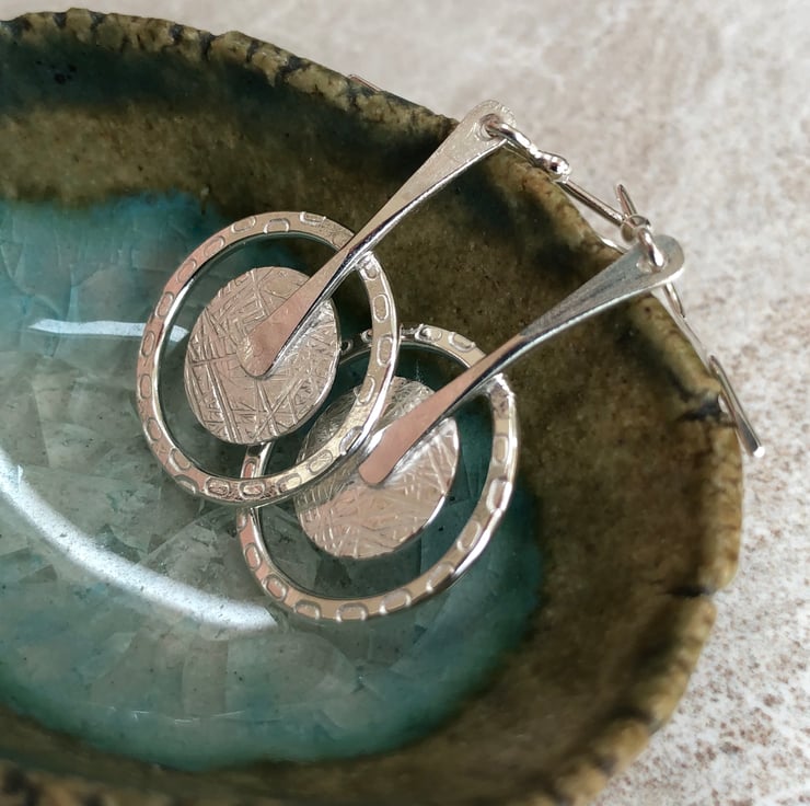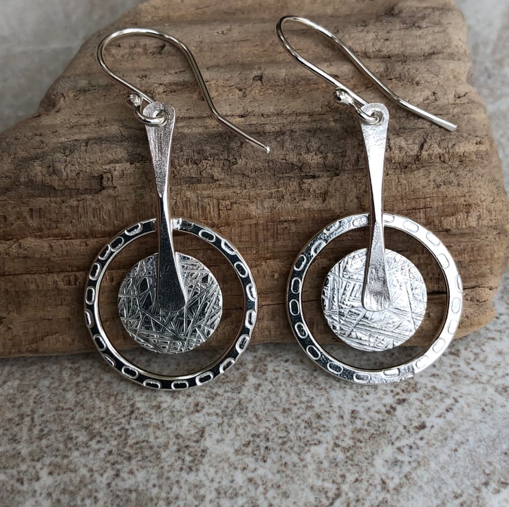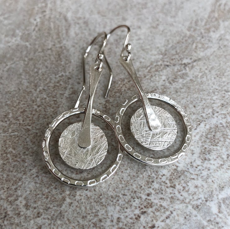 Handmade sterling silver hoop disc earrings. A lovely surface texture has been applied to these earrings using various hammering techniques. The earrings have a silver disc and hoop that are connected by a forged silver rod.