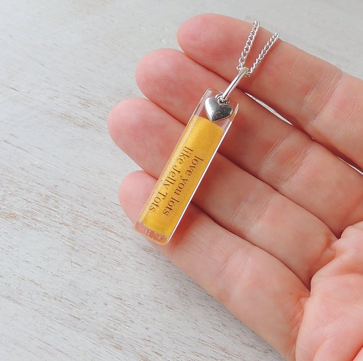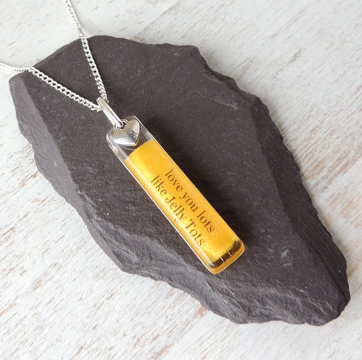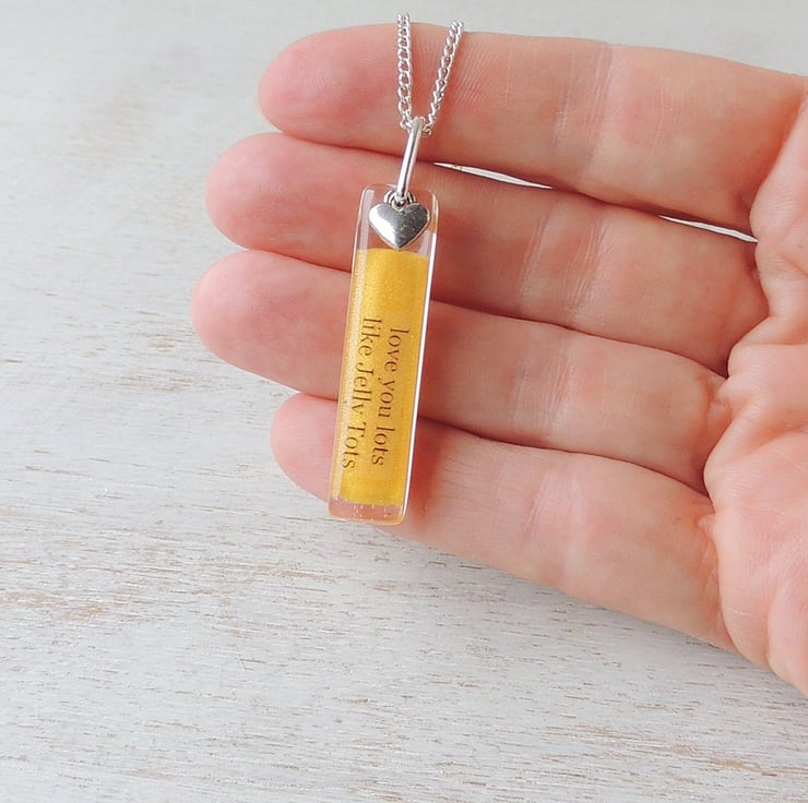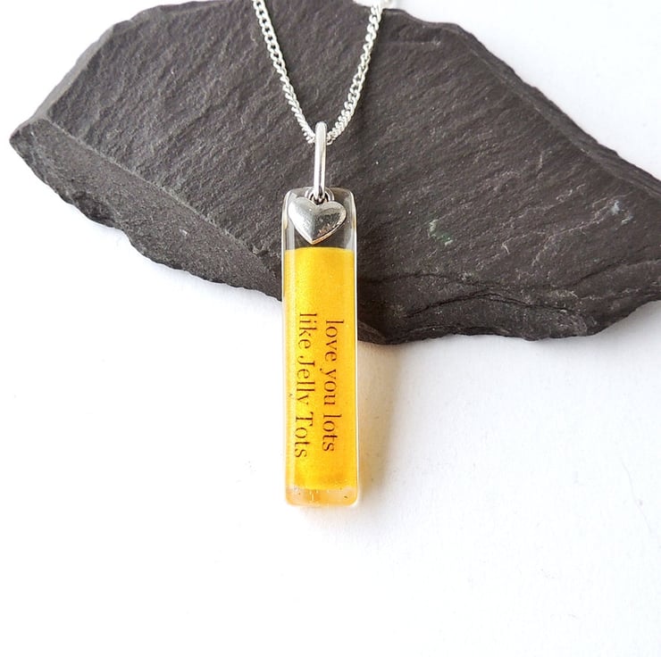 This necklace has a yellow resin pendant with the words "love you lots like Jelly Tots" and a little silver heart charm.