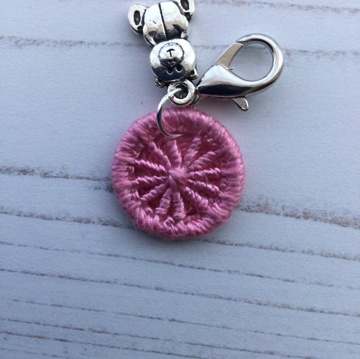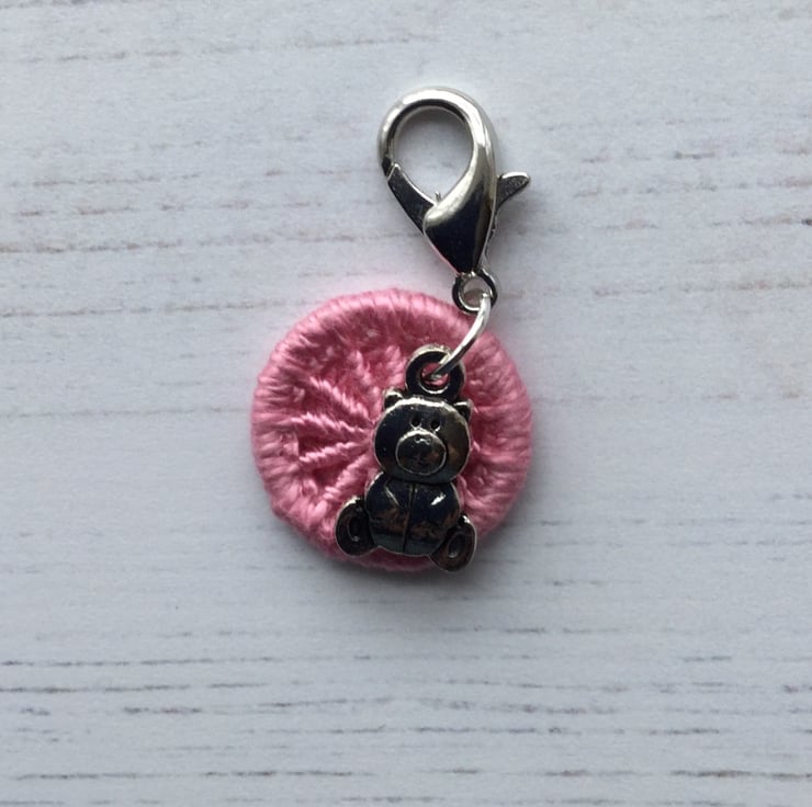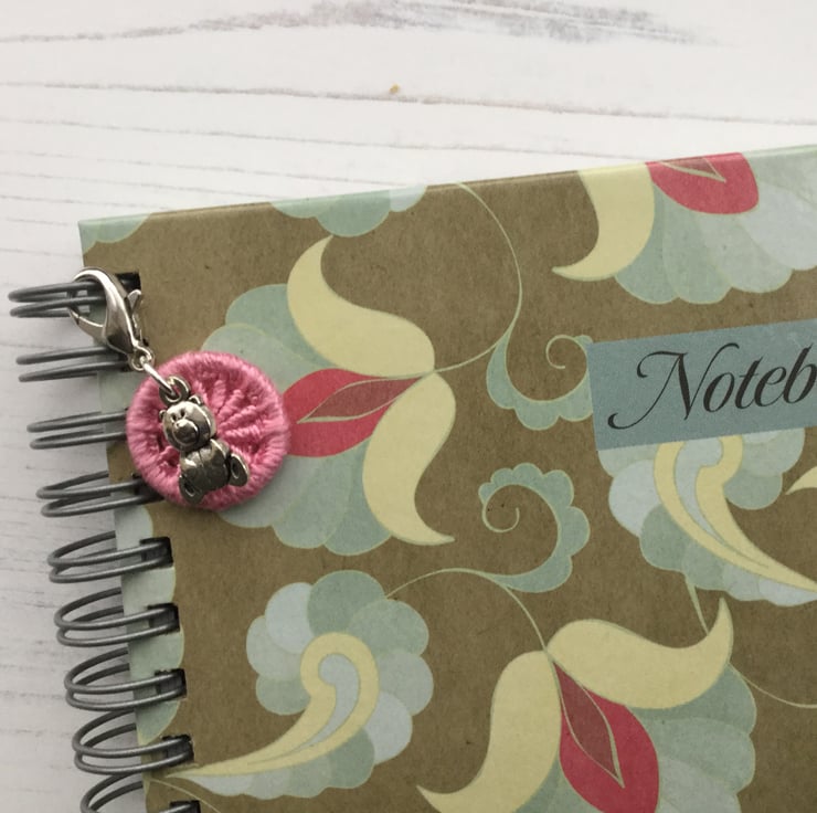 It has been fastened together with a cute white metal teddy bear charm to a small lobster claw catch to enable it to be attached easily to a bag, zip, spiral bound journal or notebook.