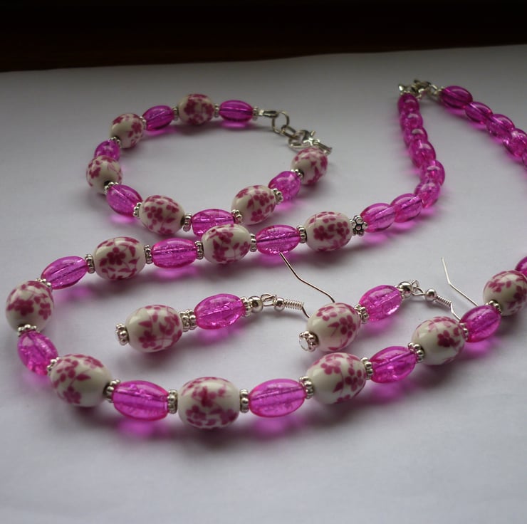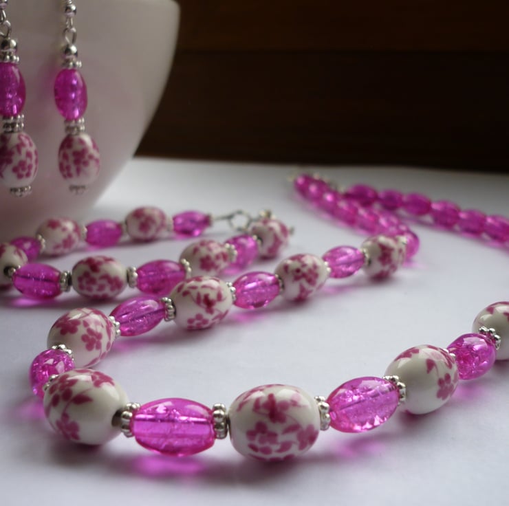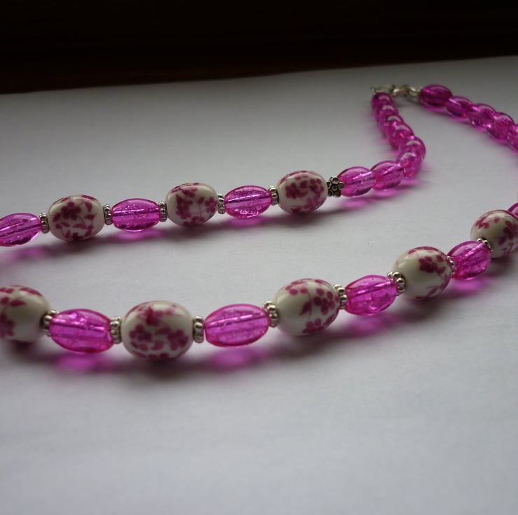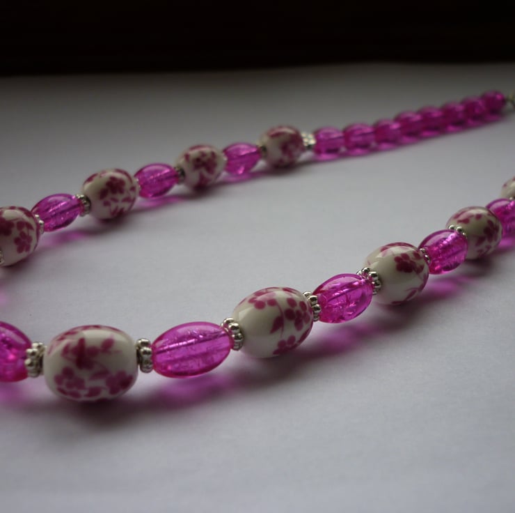 THE NECKLACE HAS BEEN MADE USING ROUND 12MM CERAMIC BEADS IN SHADES OF DEEP PINK AND WHITE FLORAL PATTERN ALONG WITH OVAL AND ROUND GLASS CRACKLE BEADS IN DEEP PINK , SMALL SILVER ROUND SPACER BEADS, SILVER FLOWER SPACER BEADS AND FINISHED WITH SILVER PLATED LOBSTER CLASP AND FINDINGS.