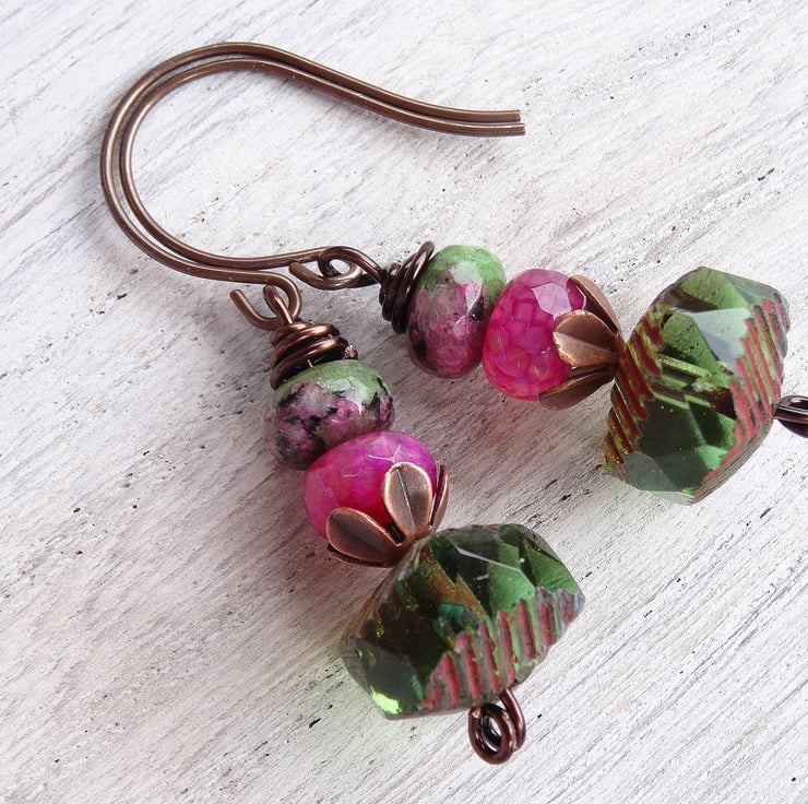 These earrings are lovely, I have made them using 15 x 12mm czech glass cruller beads in apple green with a picasso finish ribbed edging. I have also used 10 x 5mm faceted Ruby Zoisite rondells in green and fuchsia and 10 x 5mm faceted Jade rondells in fuchsia, cupped with antique bronze coloured bead caps. The earrings measure 1.75 inches (4.5cm) from top of vintaj brass, round loop, nickel free earwires.