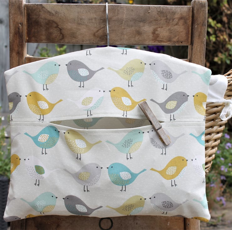 A cotton peg bag with a multi coloured Scandi bird design on a cream background. Approximately 35cm wide and 27cm long with a wooden hanger in the top. Capacity is 75-100 wooden pegs.