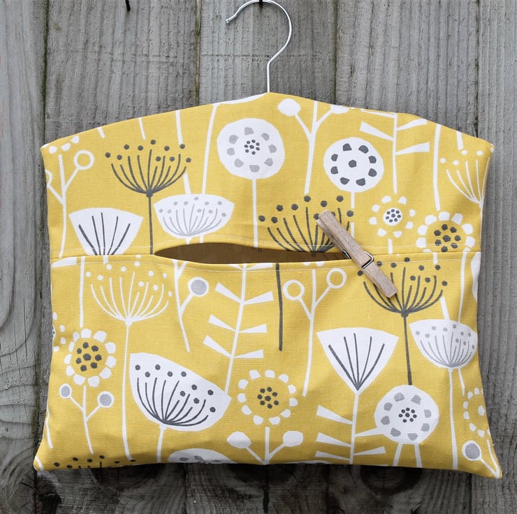 A cotton peg bag with a floral Scandi design in yellow, grey, and white. Approximately 35cm wide and 27cm long with a wooden hanger in the top. Capacity is 75-100 wooden pegs.