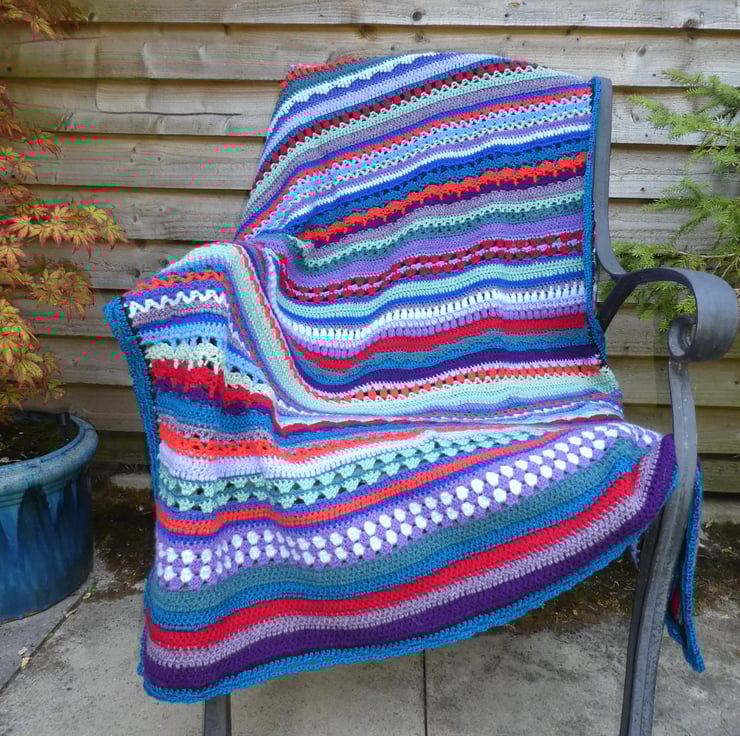 I have created this stripped crochet blanket in a mix of different crochet stitches. It has a lovely loop stitch border. The yarns used are a mix of acrylic and acrylic / wool blends, and is a double knitting weight, which is lovely and soft.