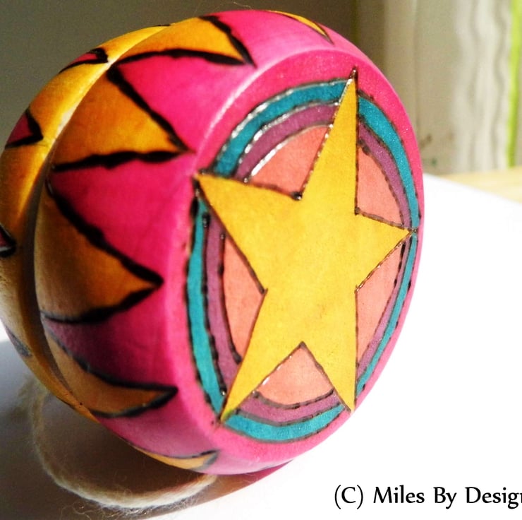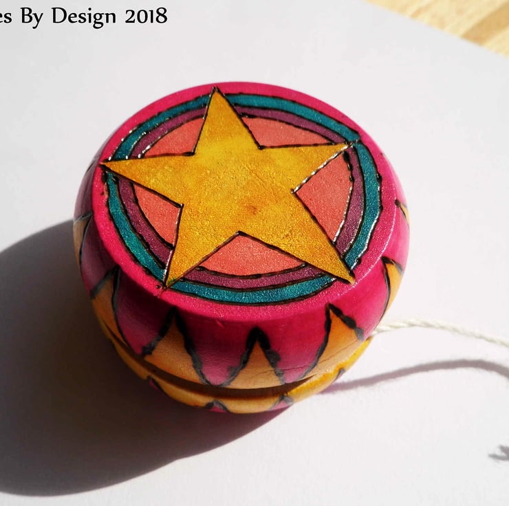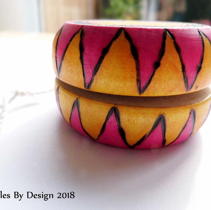 A hand pyrographied patterned wooden yo-yo, finished with bright colours and varnished for protection.