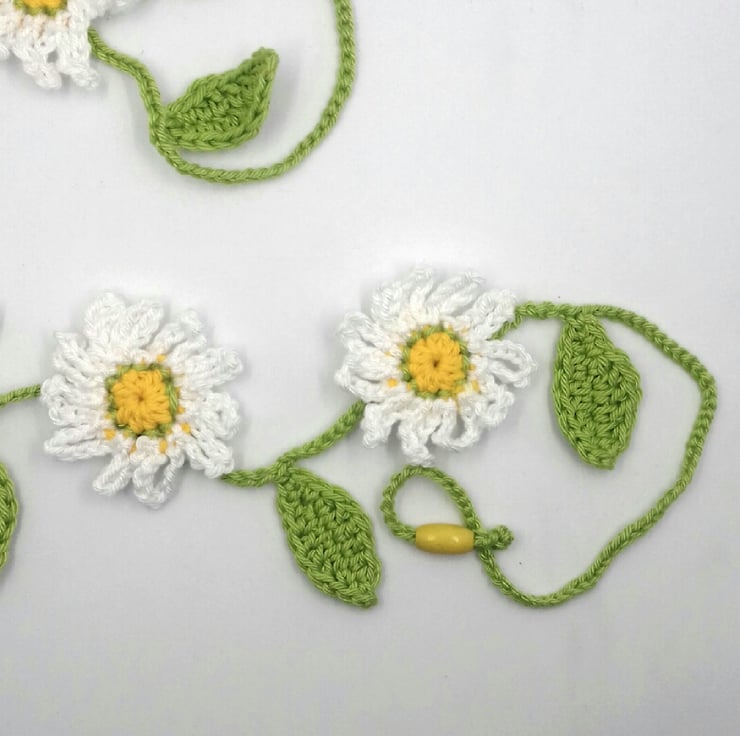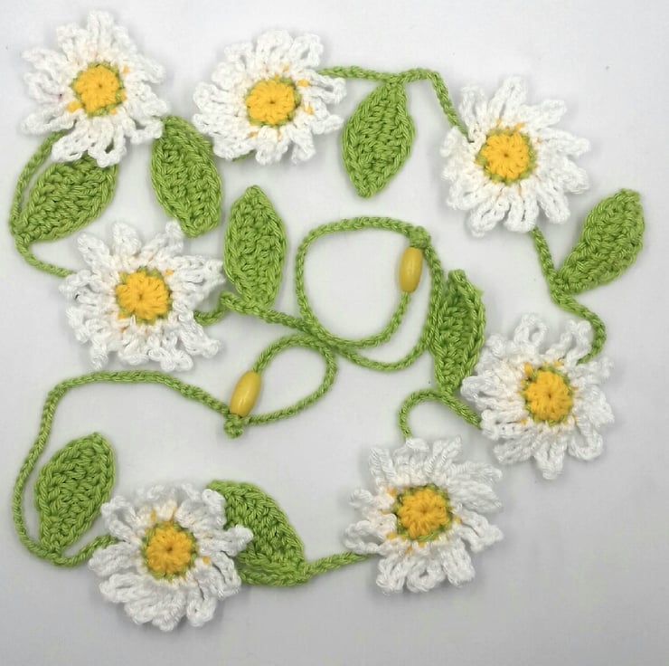 This pretty string of seven daisies and eight leaves is crocheted in cotton and finished at each end with a wooden bead. The whole string measures approximately 90 cm and comes wrapped in tissue in a labelled PIP ( Postage in Proportion ) box all ready to be gifted or posted on if required. A gift tag with a message of your choice can be added for no extra charge!