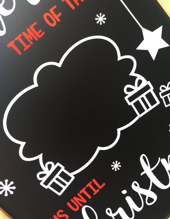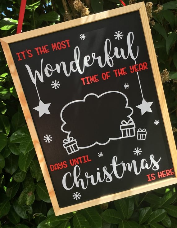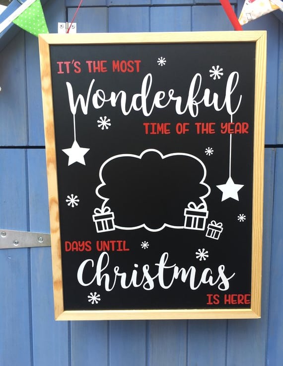 The text on this large chalk board says 'It's the most wonderful time of the year ... days until Christmas' The design features a large area for the remaining days to Christmas day to be written. This is a more traditional countdown design.