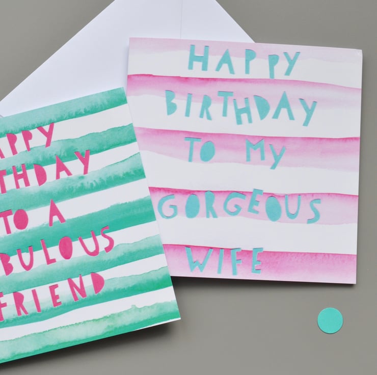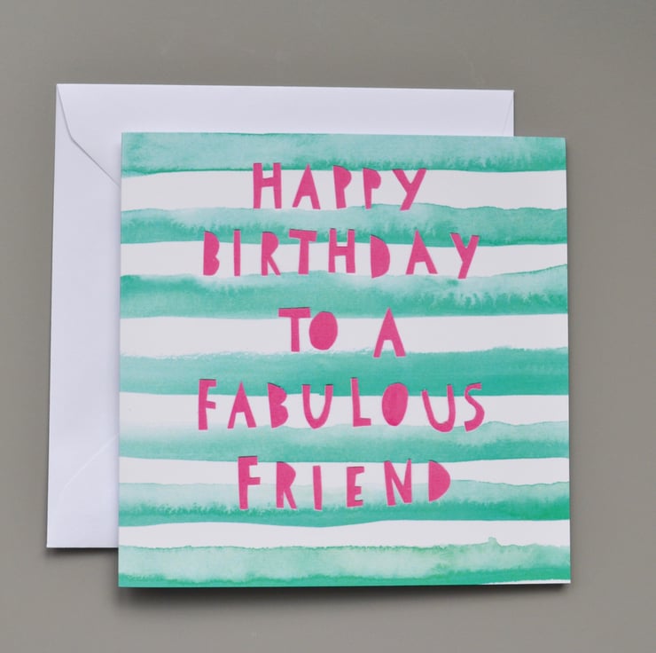 This birthday card has a background of aqua green watercolour stripes and bold hot pink text simply saying 'happy birthday to a fabulous friend'. The background was handprinted and lettering cut from paper by hand, and then digitally reproduced.
