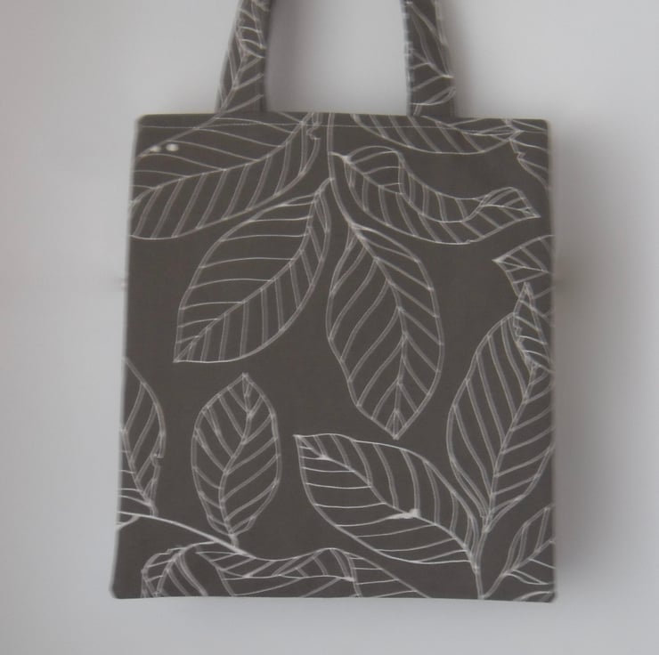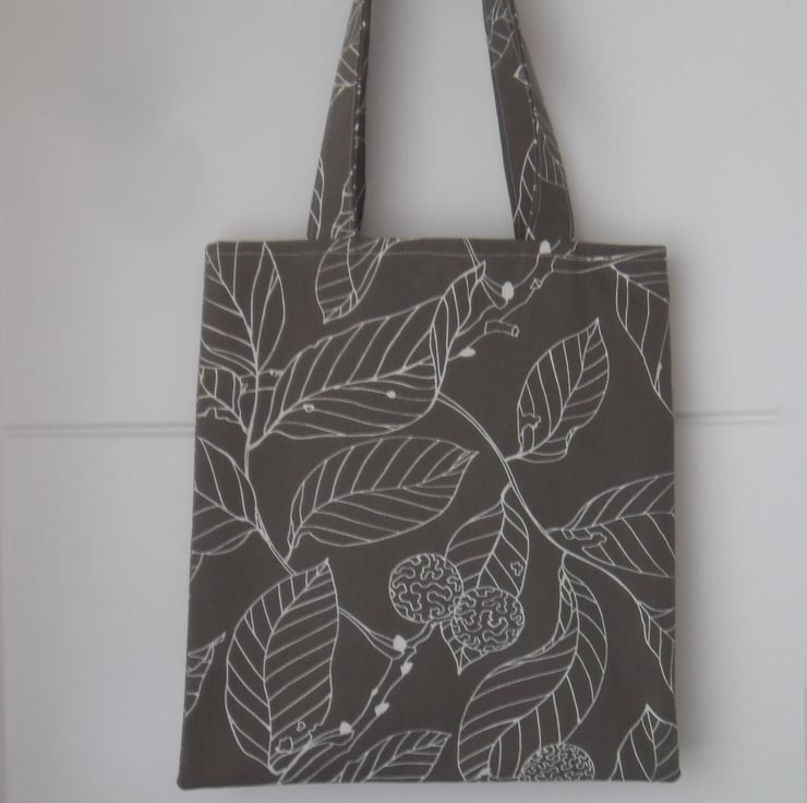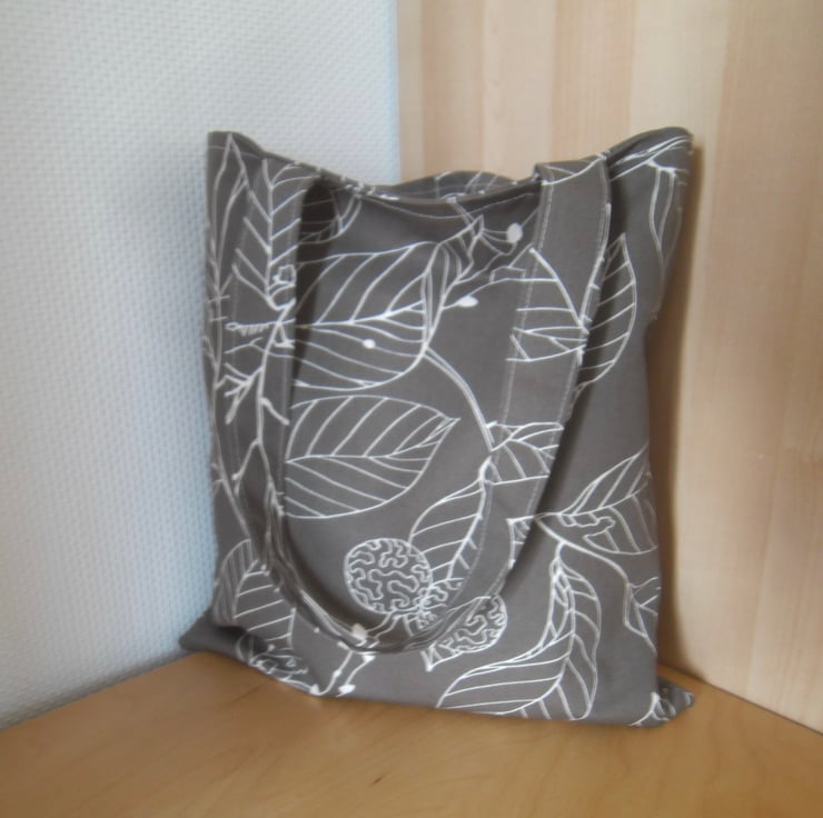A basic tote bag made using a strong cotton fabric from Ikea that has a leaf print.