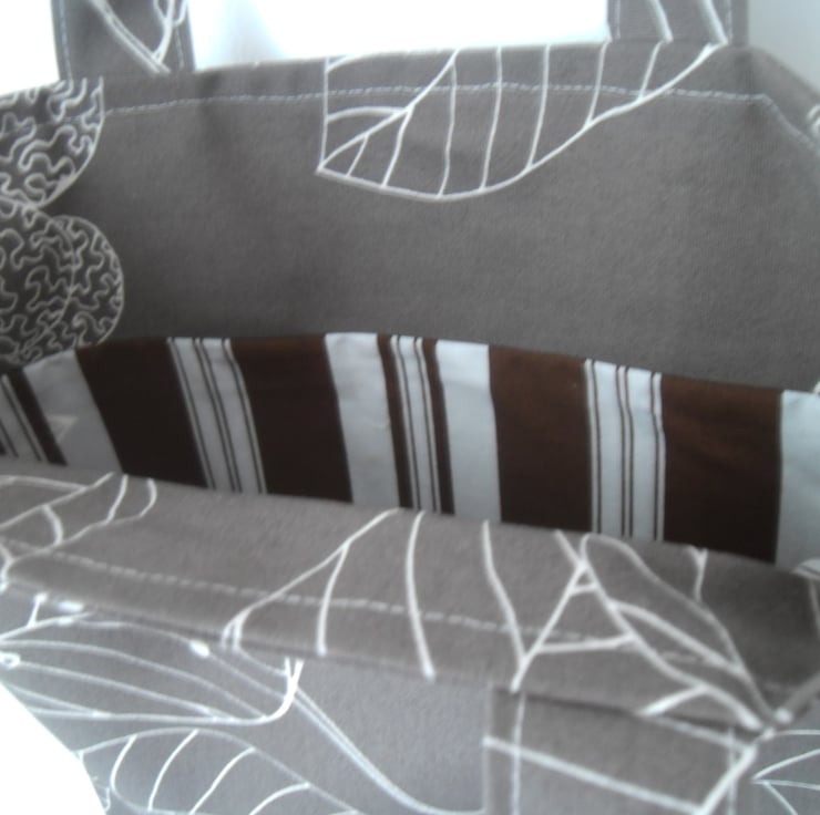 The inside is faced at the top with the outer fabric and then lined with a brown/white striped poly/cotton.