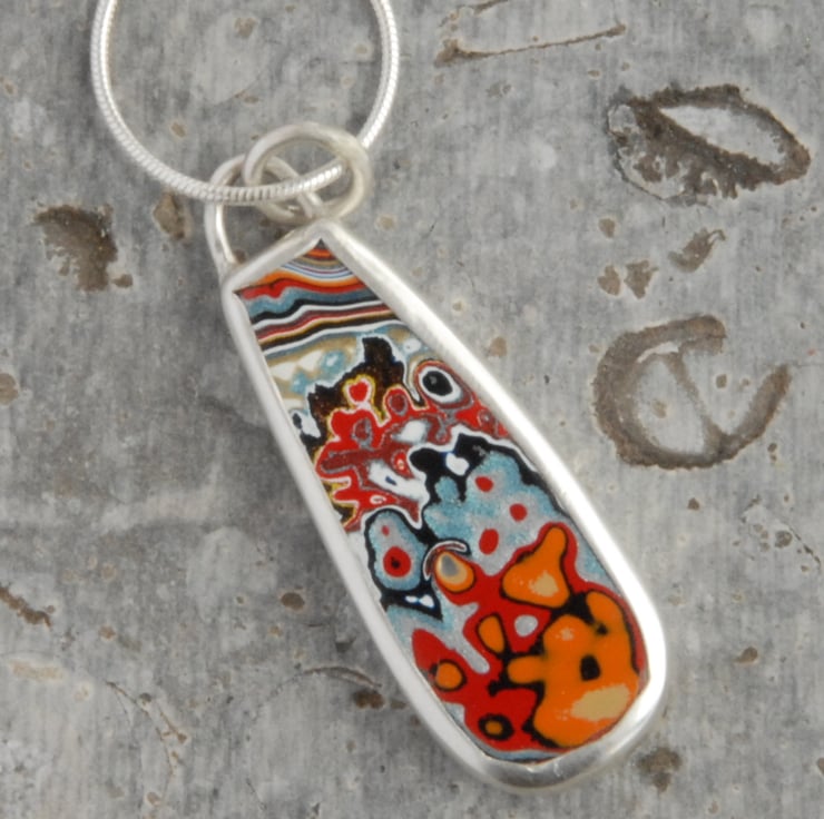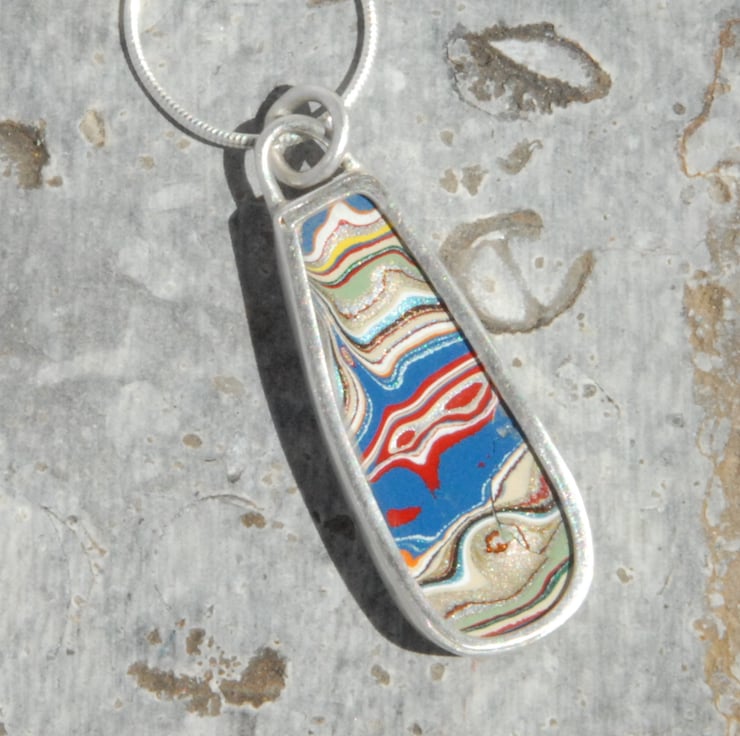 This unisex drop shaped pendant features rare Dagenham fordite which is bezel set in sterling silver. The pendant is reversible with very different patterns on the front and back, one side has a flame like pattern in red, orange, sparkly silver and black, the other side is more stripy in blue, red, sparkly gold and cream. There is a simple ring for hanging the pendant on a chain or cord (if you want me to supply one of these then drop me a message first and we can discuss lengths as this pendnat could easily be worn by either a man or a woman).