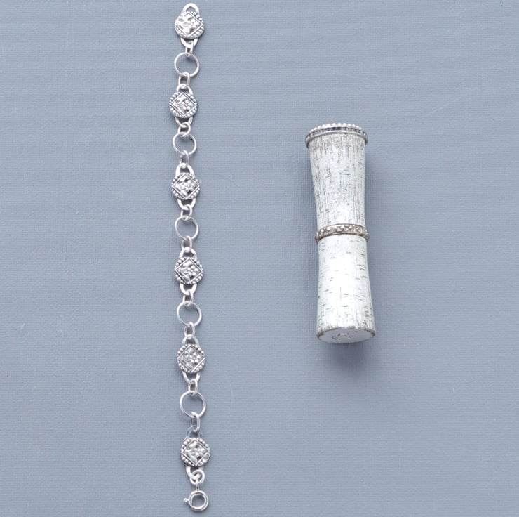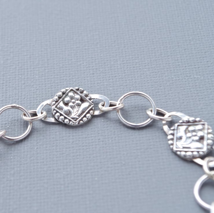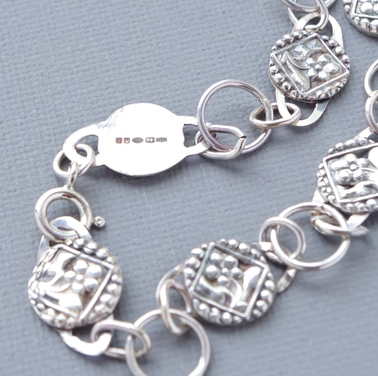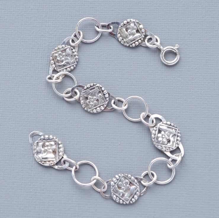 This substantial Sterling Silver chain bracelet includes links cast from a genuine Victorian glass mourning button from my collection decorated with delicate daisy flowers in recycled fine silver. All of the links are hand forged and soldered by hand to create a strong, heavy yet feminine hand made chain, which is fastened with a bolt ring clasp. This bracelet measures 180 mm or 7 1/2" long, which is an average size, but can easily be extended by adding further links, which I can do on request. The final photograph shows the bracelet at full length next to a vintage lipstick case measuring 3" in order to give a sense of scale. The bracelet features full English hallmarks, including my own makers mark with my initials and is beautifully presented in a gift box with a ribbon and bow.