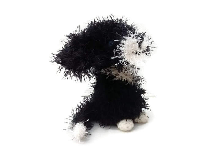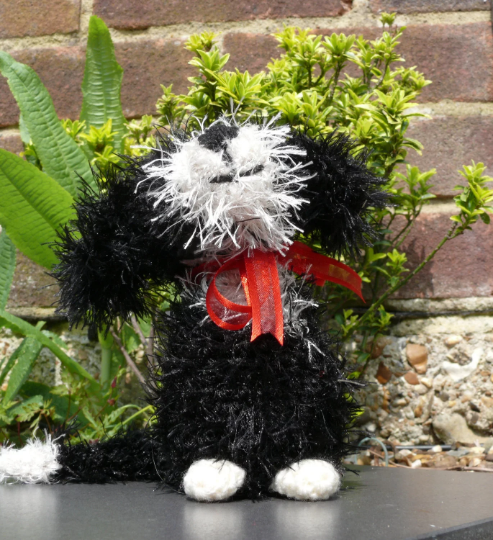 Colin is about 13cm tall and made from furry acrylic yarn in black and white with little white paws and that typical white tip to his tail.