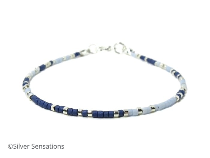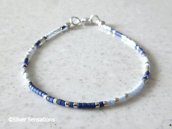 An extra slim blue & silver seed bead fashion anklet with high quality Miyuki Delica seed beads.