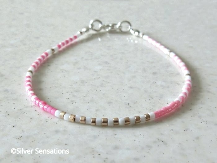 I've arranged these beads in a symmetrical stripey design with a small amount of light rose gold beads around the bracelet, creating a wonderful contrast to the pink & white.