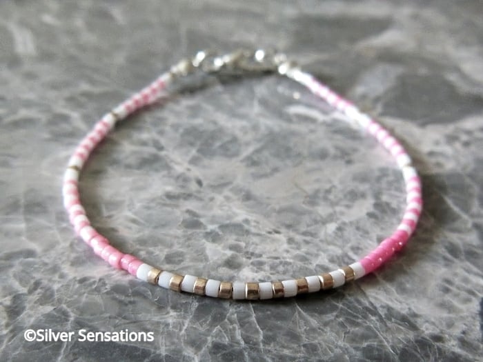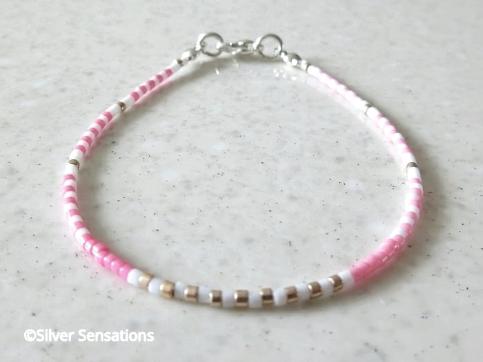 This pink & white stripe seed beads bracelet has been handmade using tiny Miyuki Delica seed beads.