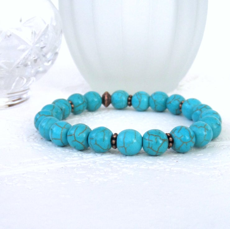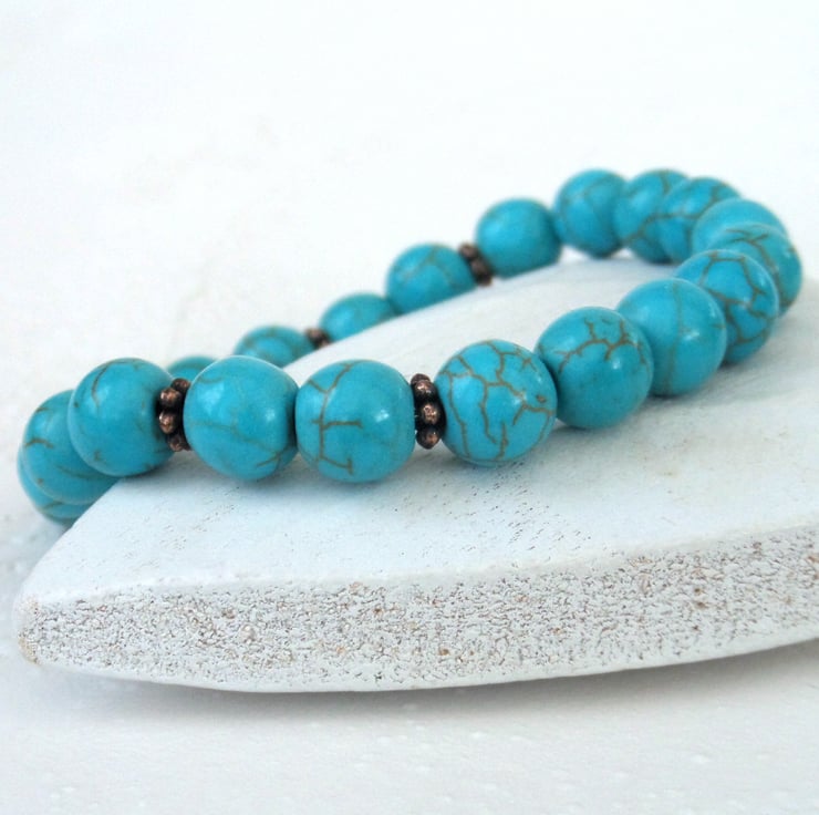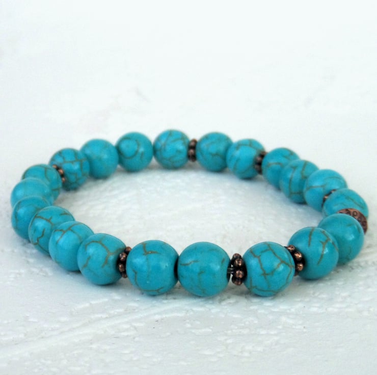 Stunning turquoise blue bracelet, made with turquoise coloured howlite and little copper beads and threaded onto jewellery elastic.
