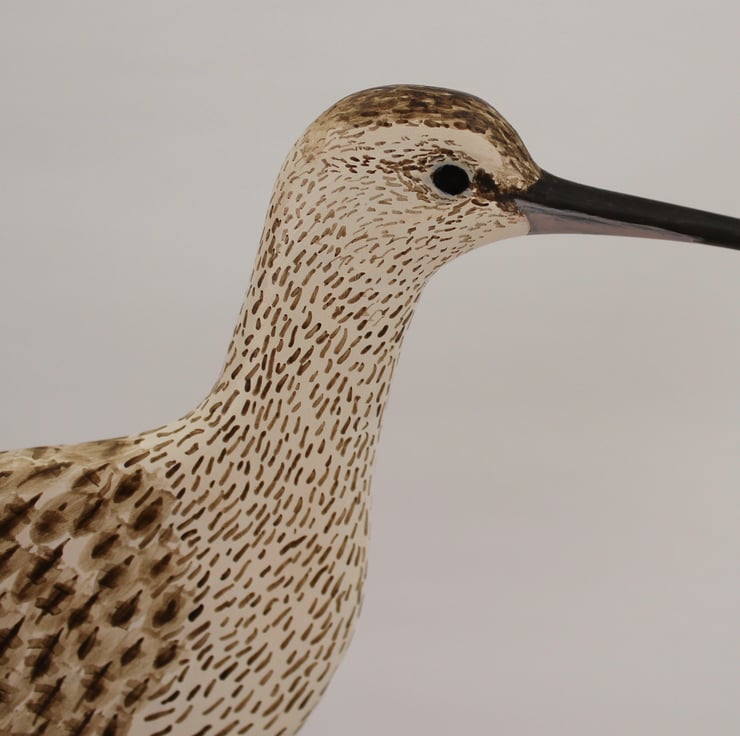 This curlew is hand carved from 9mm thick lime and hand painted with artists acrylics. It has been finished with wax giving it a soft shine and mounted on a small piece of driftwood. This may be just a bird in profile but it has been made and painted with the same care as the larger ones and from a distance you cannot tell that it has no depth making it perfect for a narrow shelf. It is 21cm tall, 22cm from beak to tail and the base is 4cm deep (bird 9mm deep) SN382