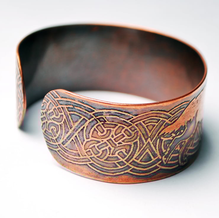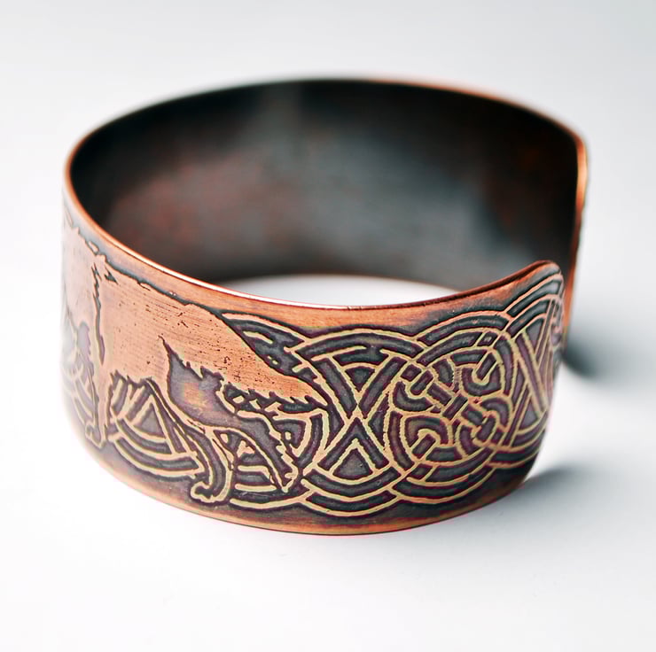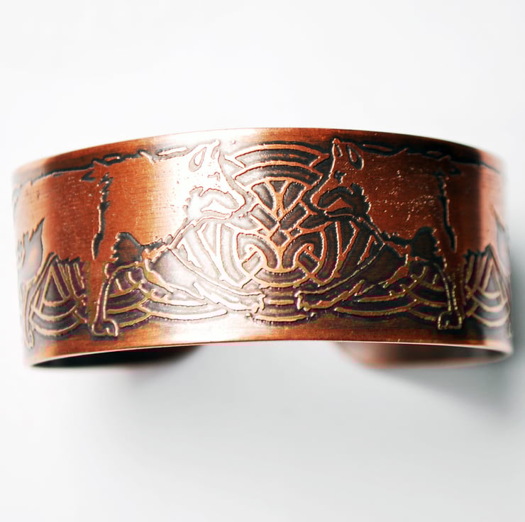 This is a copper celtic wolf cuff bracelet bearing my own unique design of two wolves on a celtic knotwork background. Based on Viking Norse mythology around Odin's wolves Geri and Freki.