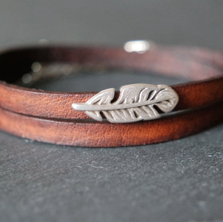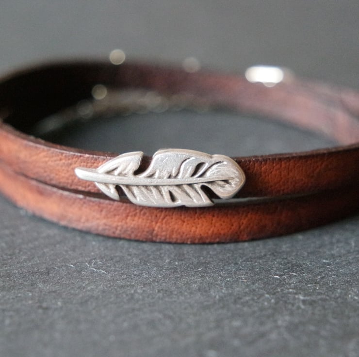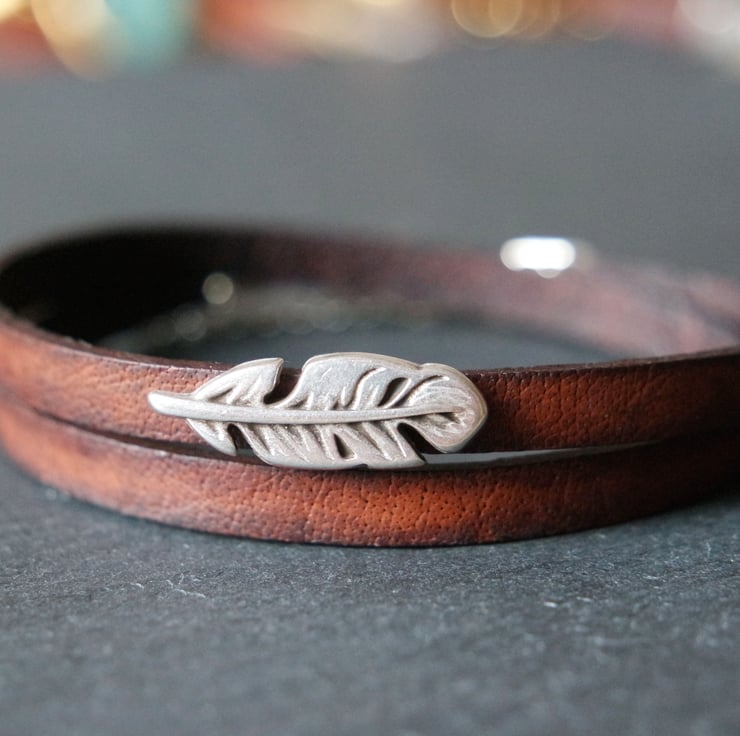 A beautiful dark brown leather bracelet with silver coloured feather slider bead charm.