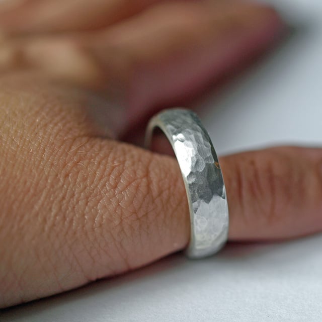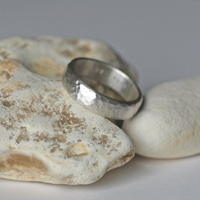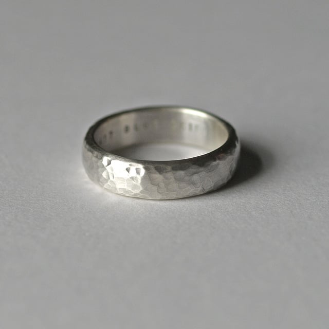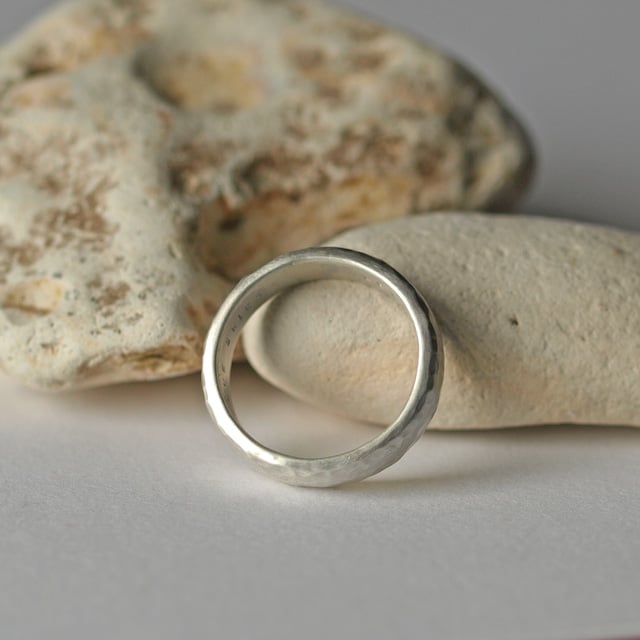 This chunky 6mm wide band D shaped ring has been handmade in recycled sterling silver. D shaped wire has been given a hammered texture and then formed into the ring shape. The ring is given a matt brushed finish but can be fully polished if preferred.