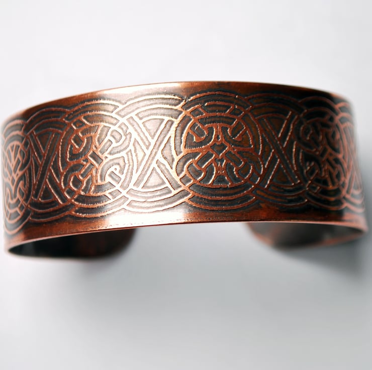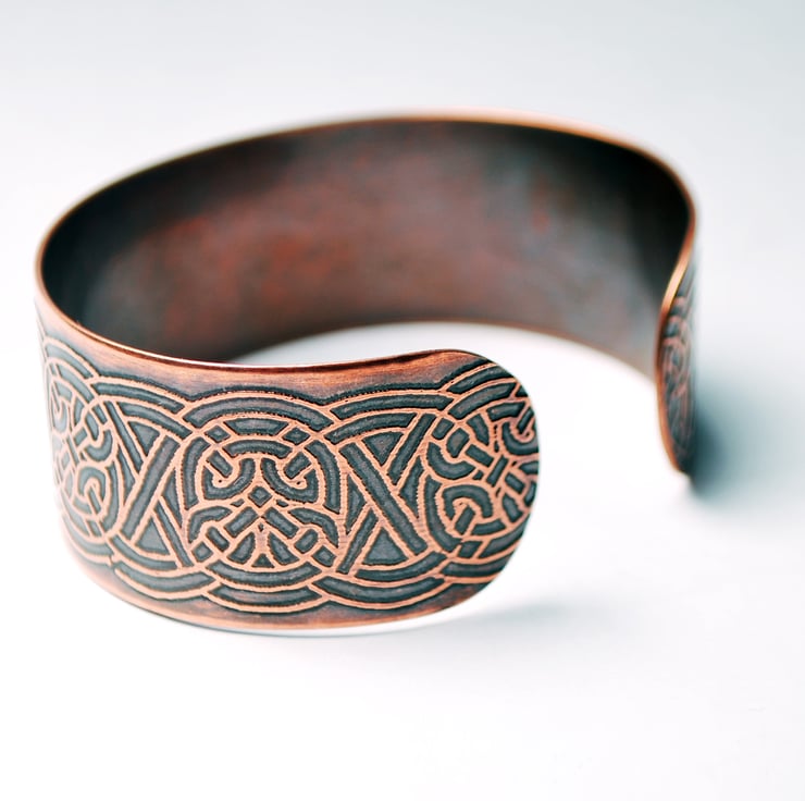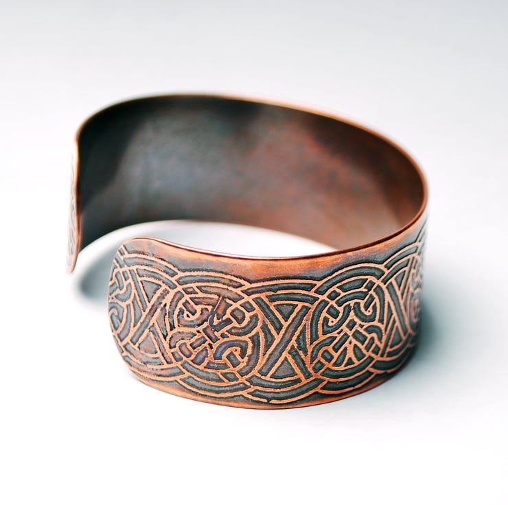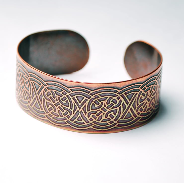 This Copper Celtic Knotwork cuff bracelet bangle is made from solid copper and is decorated with my own version of a Celtic Knotwork design. It has been oxidised to give it a two tone appearance.