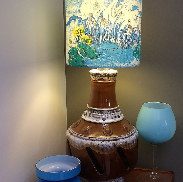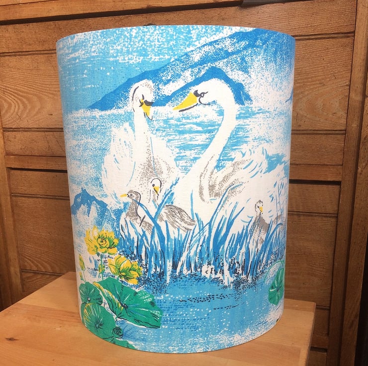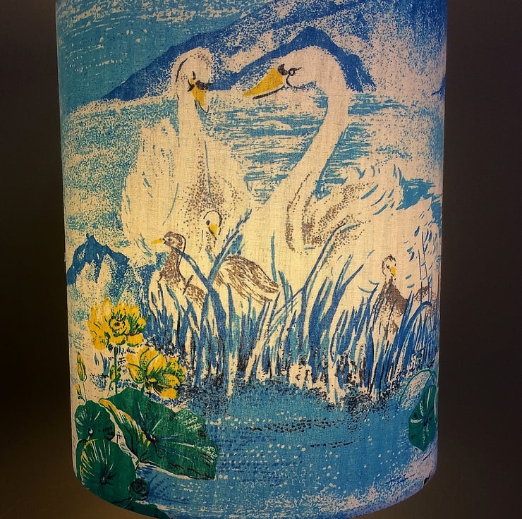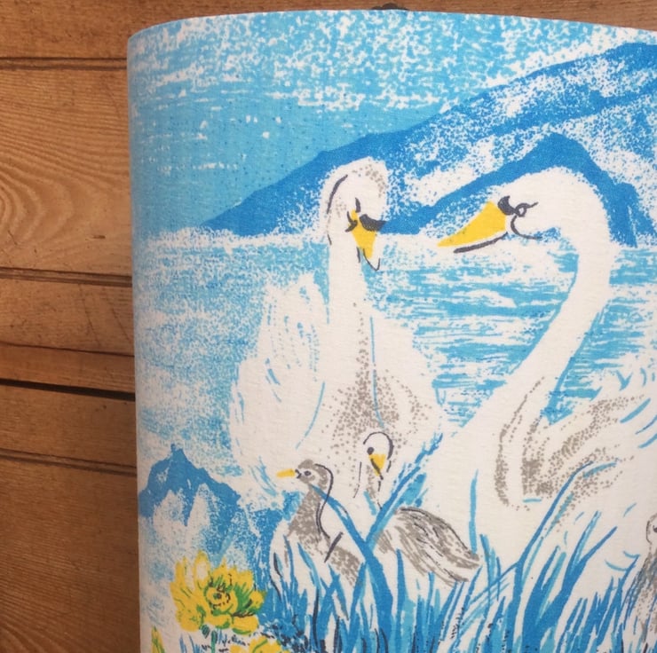 A Beautiful Blue SWAN RETRO Vintage Fabric Lampshade - the fabric is circa late 50s or early 60s I would imagine . Very unusual Lampshade in a wonderful vintage fabric - you won't find another I am sure!