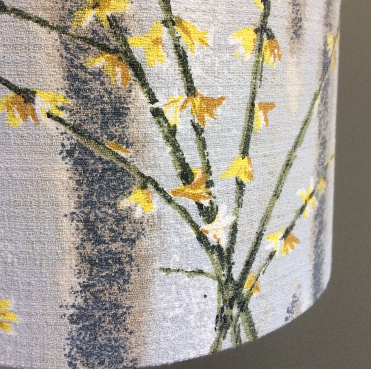 Lovely Grey and Yellow Jasmine Forsythia Country House Vintage Fabric Lampshade - the fabric is circa late 50s or early 60s and is of a type known as BARKCLOTH. Highly sought after by vintage collectors.