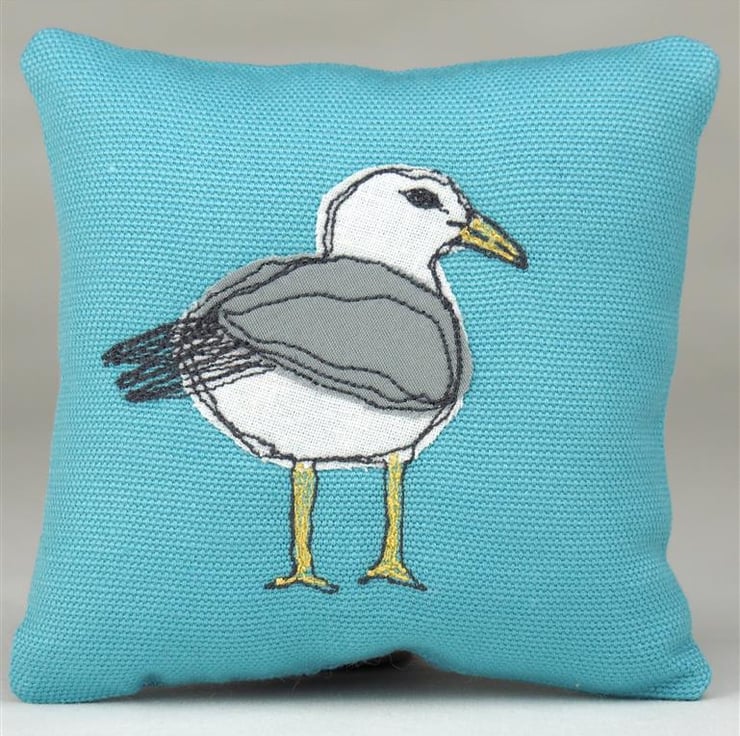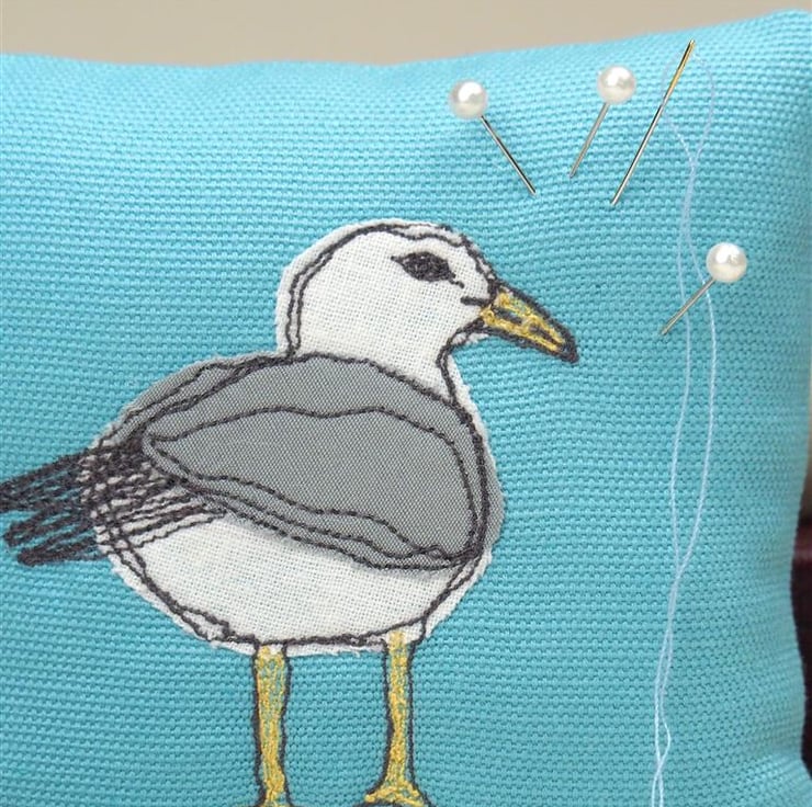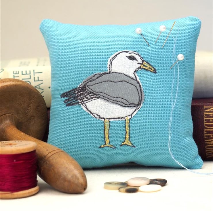 Handmade in Cotton and featuring my own Seagull design this pretty little pin cushion would make an ideal gift.