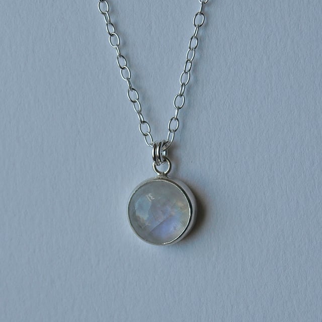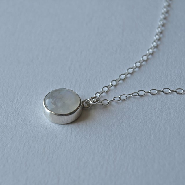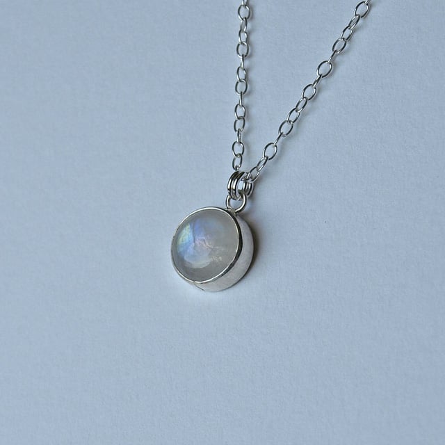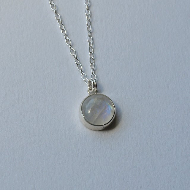 A beautiful 10mm round cabochon shaped rainbow moonstone is set in a traditionally handcrafted sterling silver pendant, hung on a sterling silver chain.