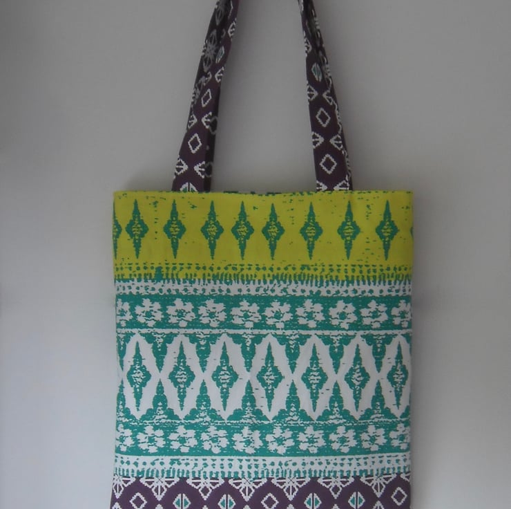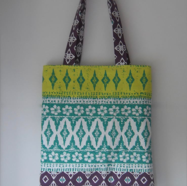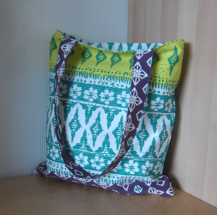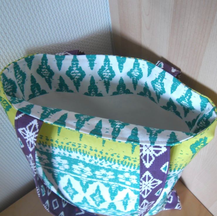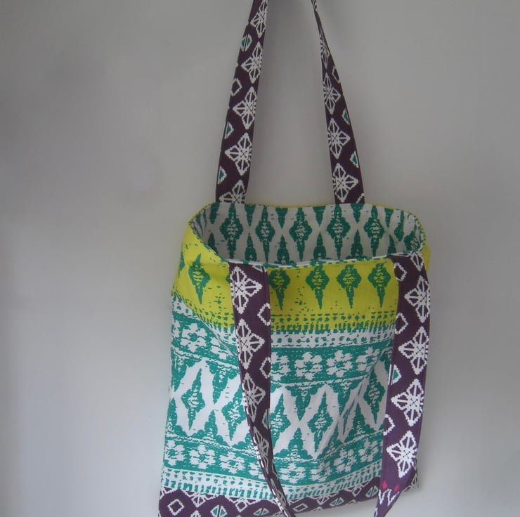 A basic tote bag made using a strong cotton fabric in lovely bright print which I purchased at Ikea.
