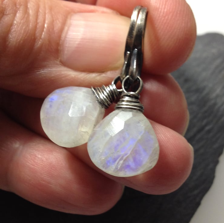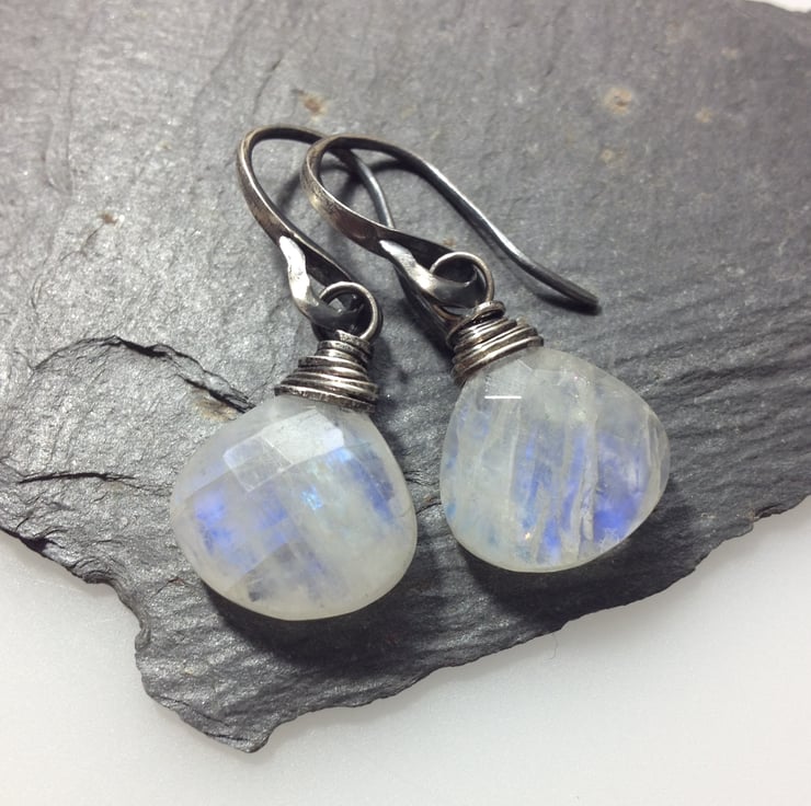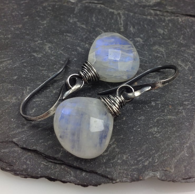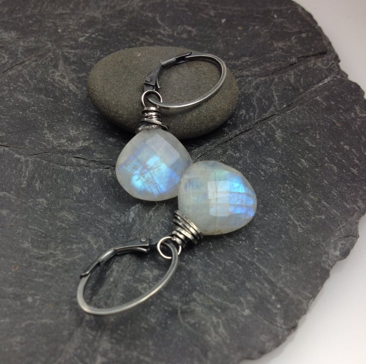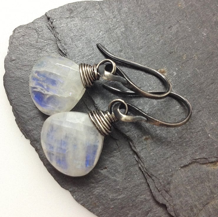 Faceted blue moonstone teardrops with a generous blue flash - wrapped in oxidised silver and hung from lever back hoops or sculptural sterling hooks . Please leave me a message at checkout with your preference , if none stated I will send hooks as pictured.