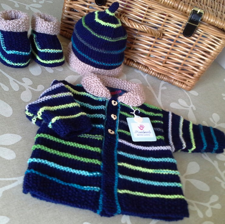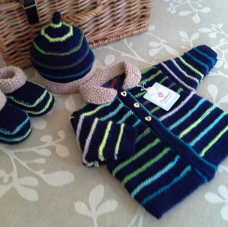 A lovely eye catching traditional baby boy's layette set designed with a modern twist for today's fashionable mother's requiring individuality for their baby. This set would make a perfect newborn gift any mother would love to receive. All branded machine washable yarns are made in the UK for guaranteed quality, making the set ideal to be passed on for other babies within a family or friends babies once outgrown. The luxury designer garment label is attached to the back neck edge of the jacket with the care instructions woven within it and proof of it's designer origins. The sweet buttons are heart shaped made from genuine wood.