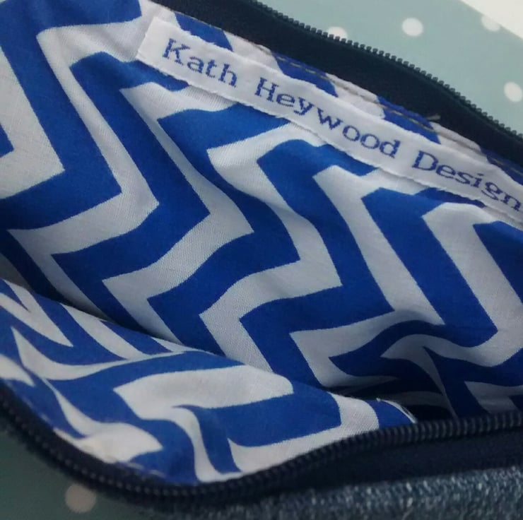 Lined with offcuts of chevron design cotton and a salvaged nylon zipper.