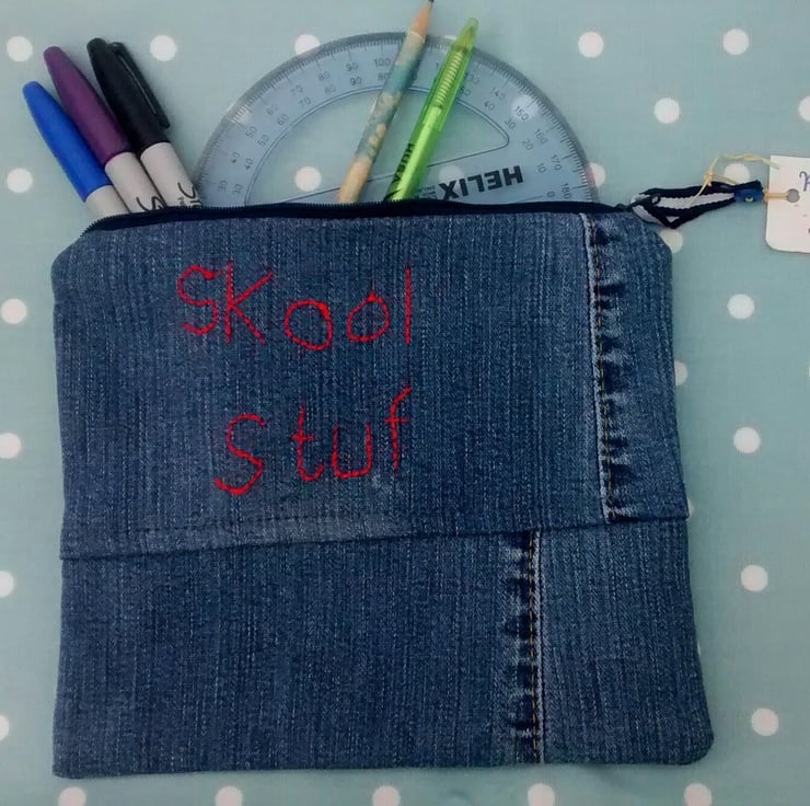 Large handmade pencil case in repurposed blue denim and cotton with the words 'Skool Stuf' hand embroidered in red.