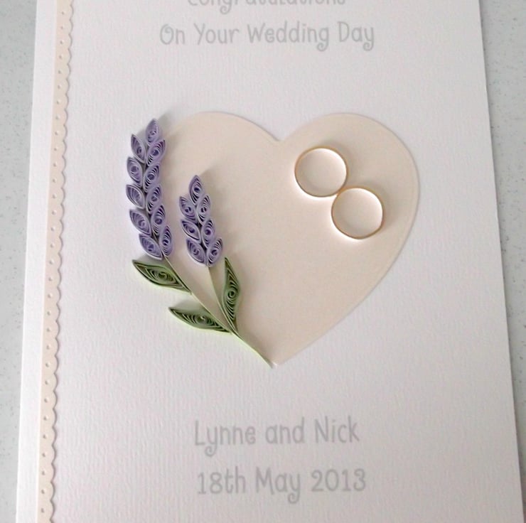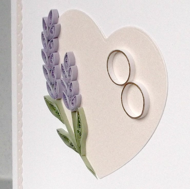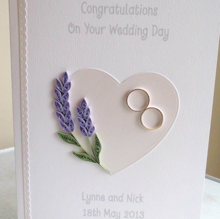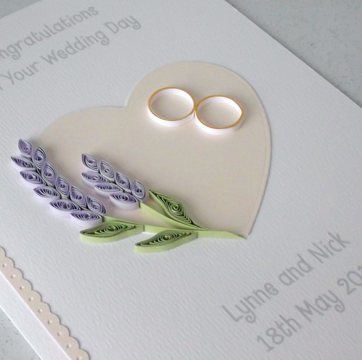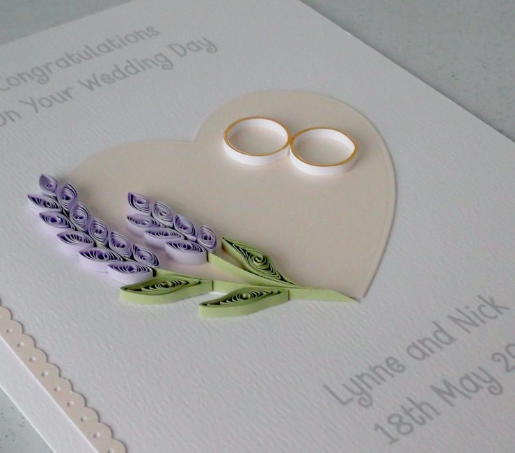 A beautiful quilled wedding card with quilled lavender and quilled wedding rings, set on a pearlised heart, perfect for sending very special congratulations to the happy couple on their special day.