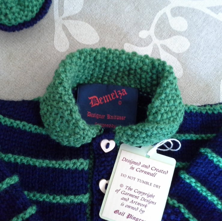 Baby knitwear is designed and hand crafted by Demelza Designs in Cornwall meeting UK baby safety standards, Only branded premuim acylic, acrylic/natural fibre blends or pure natural fibre yarns are used in baby knitwear which conforms to BS984/76 standards.