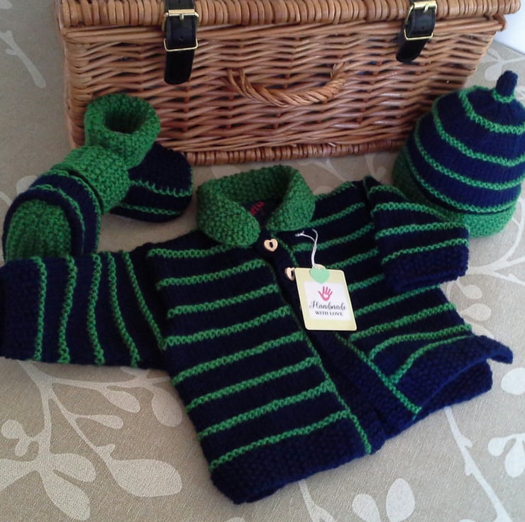 A very sweet prectical designer baby boy's layette set any mother would be proud to dress her baby in. This set would make a perfect newborn gift for parents whom value and appreciate genuine hand made baby clothes which are totally unique and not mass produced.