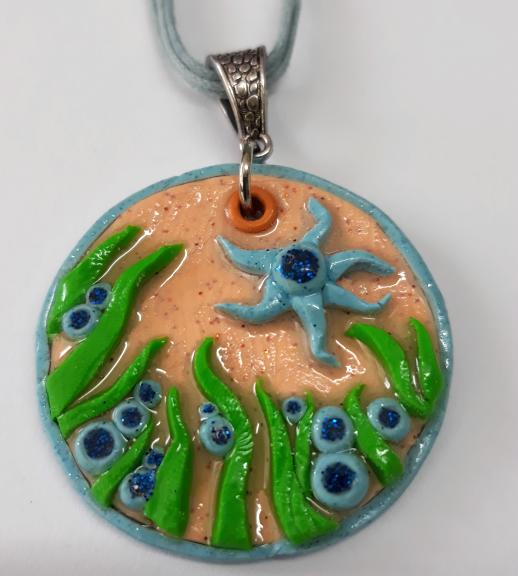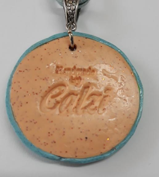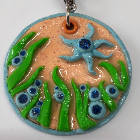 Another sea themed pendant, this one has a glittery peach base with the design in light blue and a bright mid green, I have also added darker blue glitter in translucent clay.