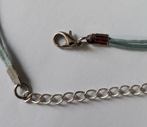 The pendant is approx 4cm diameter, comes on a 43cm/17" 3 strand light blue cord with a lobster catch fastener, I have added a top coat of resin.
