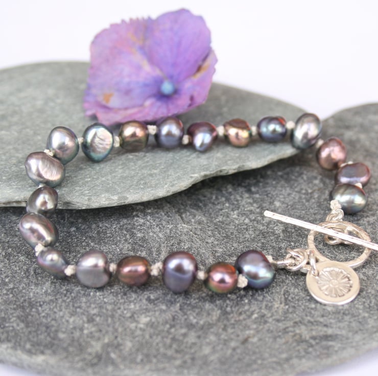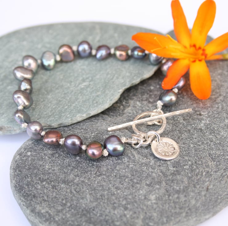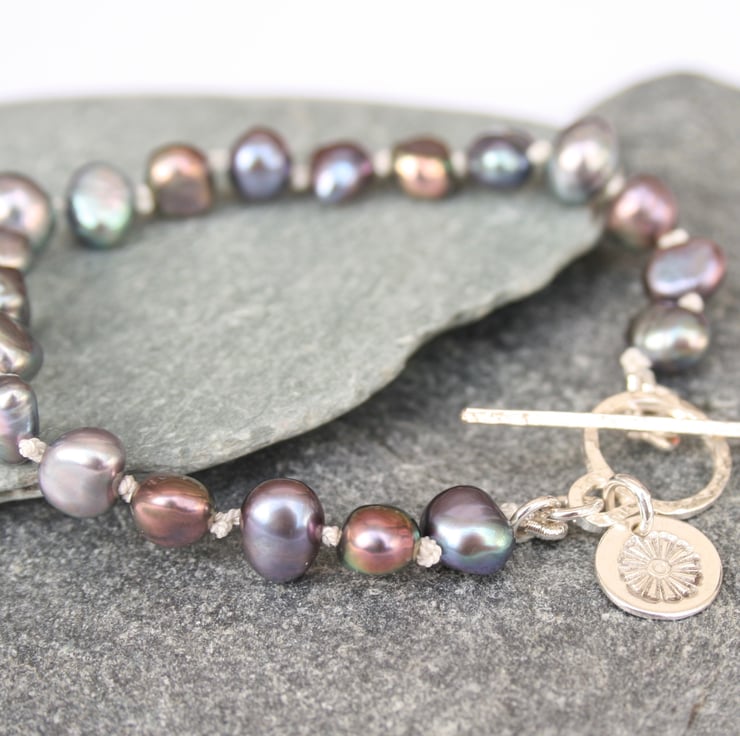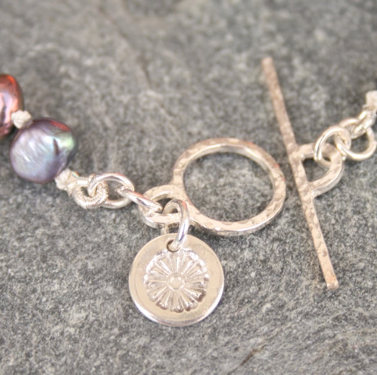 I have hand knotted between each pearl and attached them to a hand made sterling silver toggle clasp which I have given a textured surface. The bracelet also has a sterling silver disc attached to the toggle onto which I have hand stamped a flower although if you would prefer an initial then please just leave me a message with your order.