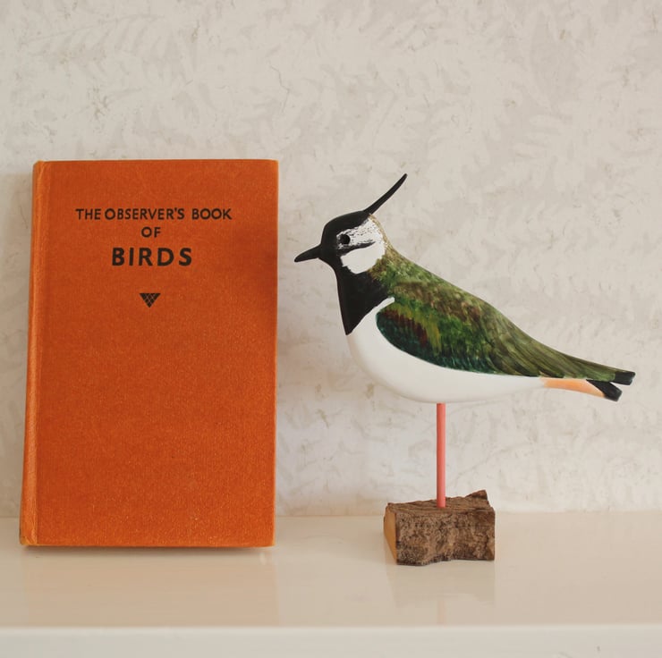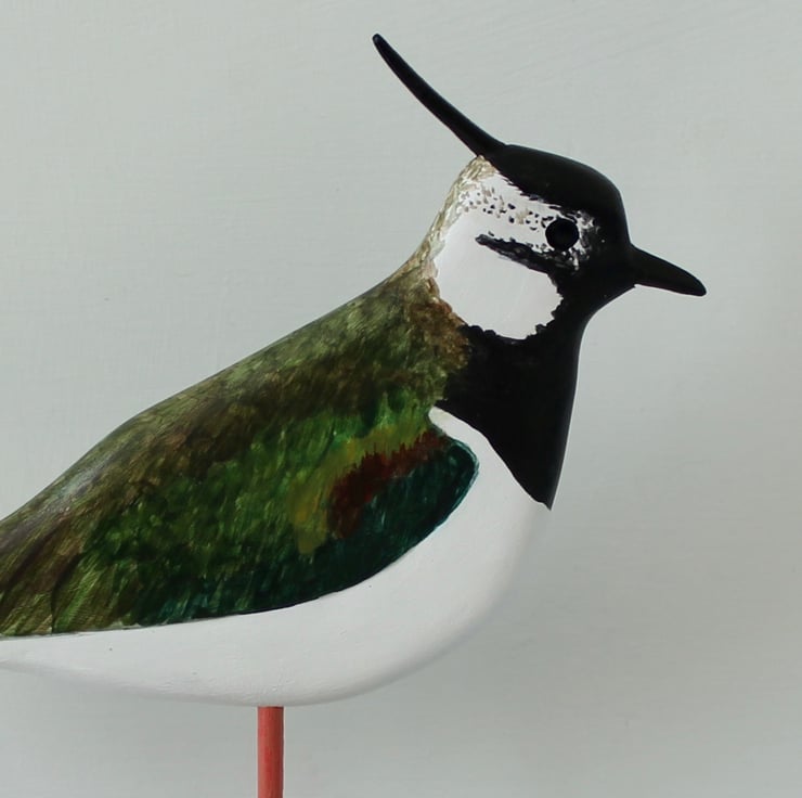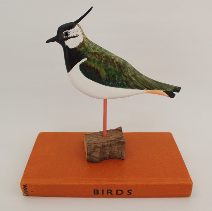 This small lapwing is carved from 9mm lime and hand painted with artists acrylics. It has been finished to a soft shine with wax and is mounted on a square of driftwood. It is 14cm tall, 13cm beak to tail and the base is 4.5cm deep (The bird is just 9mm thick) This little bird would look lovely on a narrow shelf anywhere. (SN384)