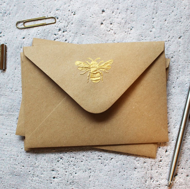 - 5 brown kraft C6 envelopes embossed with the bee design and hand finished with gold ink.