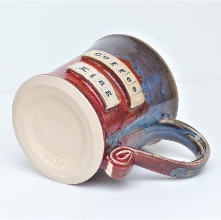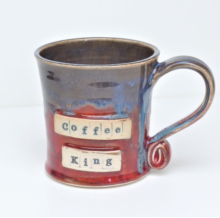 Coffee King, in lovely letters, are stamped in raised clay around the side of the mug.