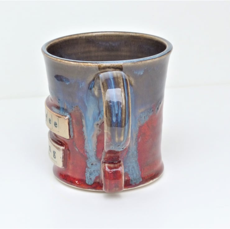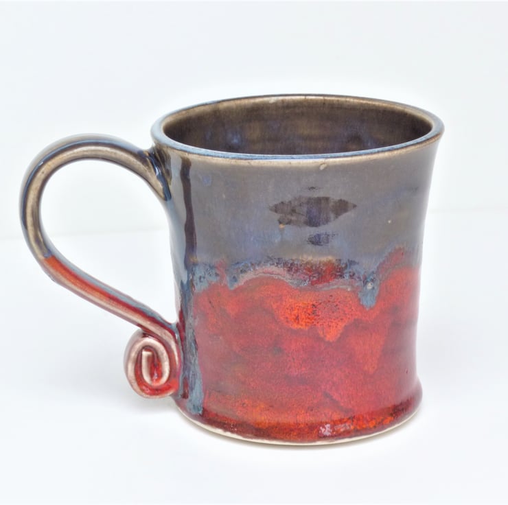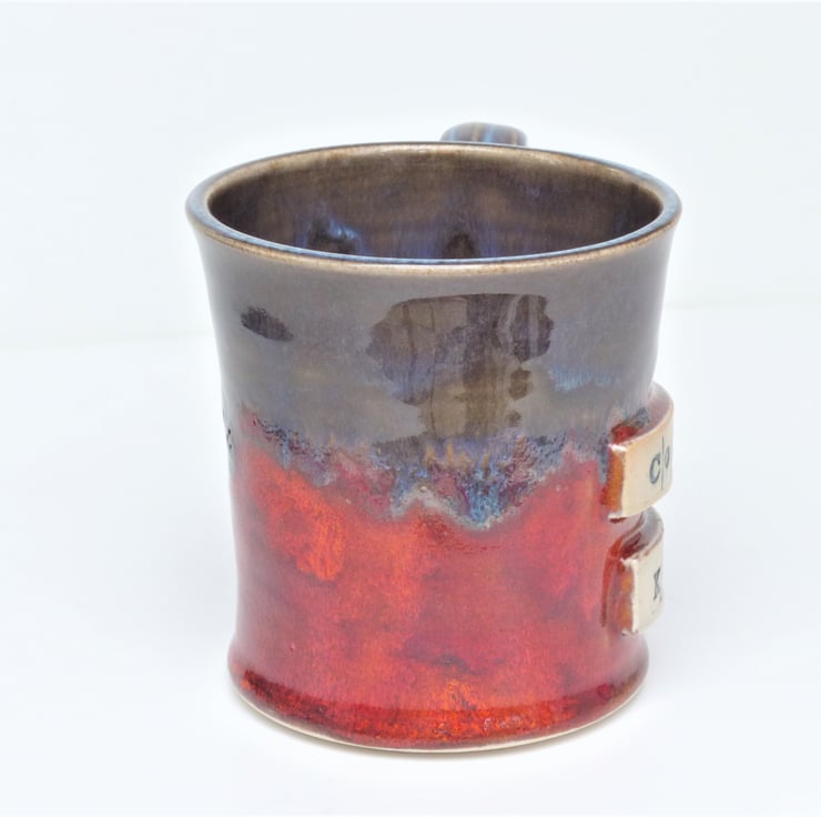 This one I threw on the potter's wheel using a buff stoneware clay. I then turned the base and added the handle and decoration before bisque firing the mug. I glazed it using a lovely heavy cloud blue and firey reds and refired to 1240C stoneware making it strong and durable.